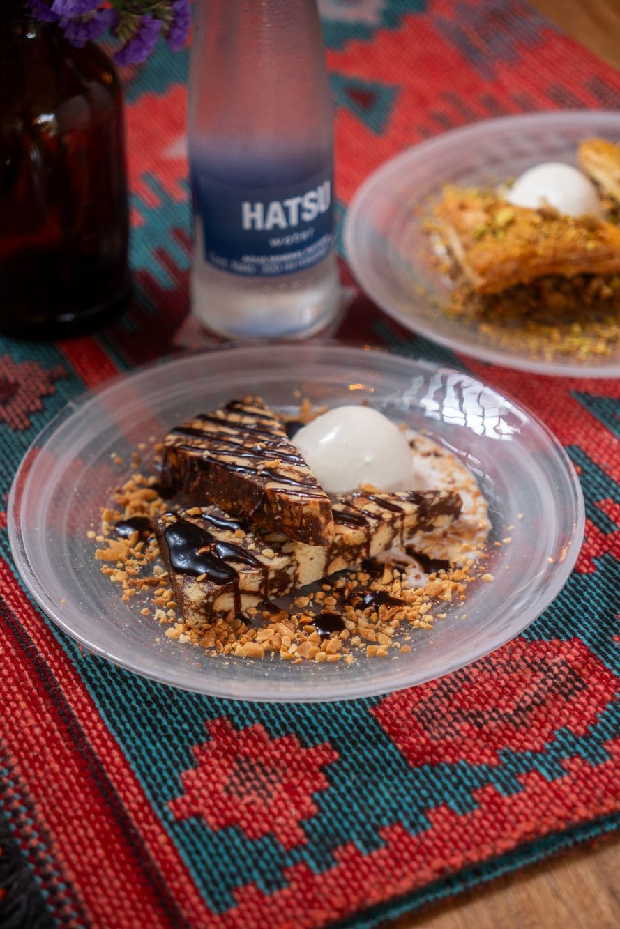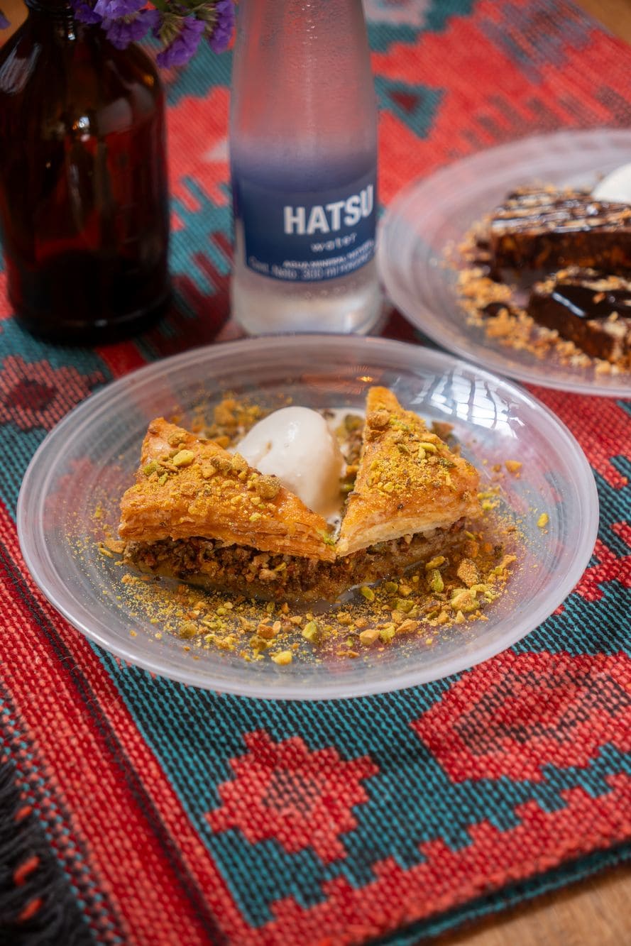 - Baklava: Tradicional postre turco, hecho de para filo relleno de pistachos y nueces de nogal, bañado en almíbar de cardamomo y limón roa, acompañado de helado de vainilla.