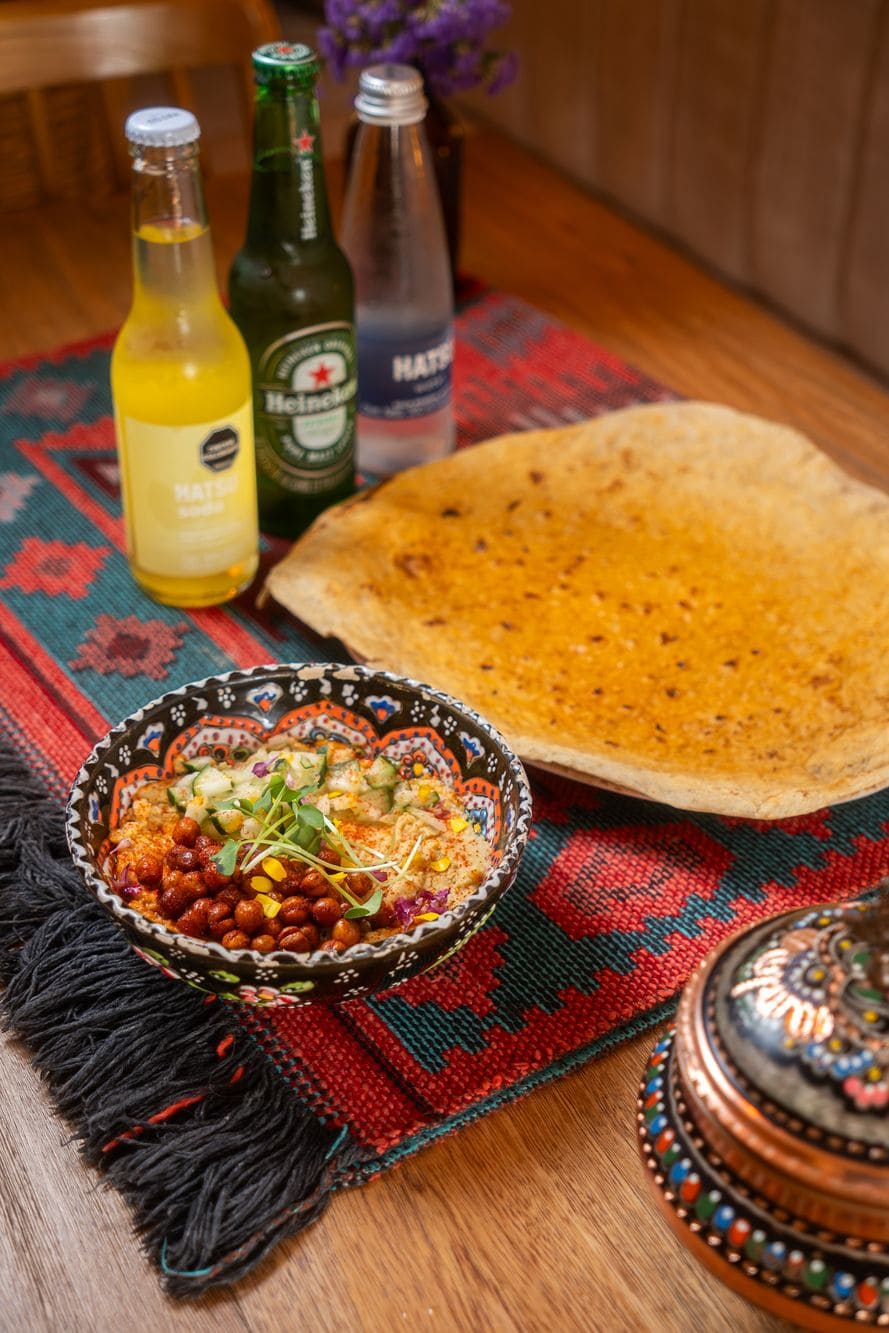 - Hummus con pan árabe: Nuestro delicioso hummus hecho de la manera tradicional, con trozos de pepino fresco y garbanzo crocante, acompañado de pan árabe fresco con un toque de mantequilla especiada.