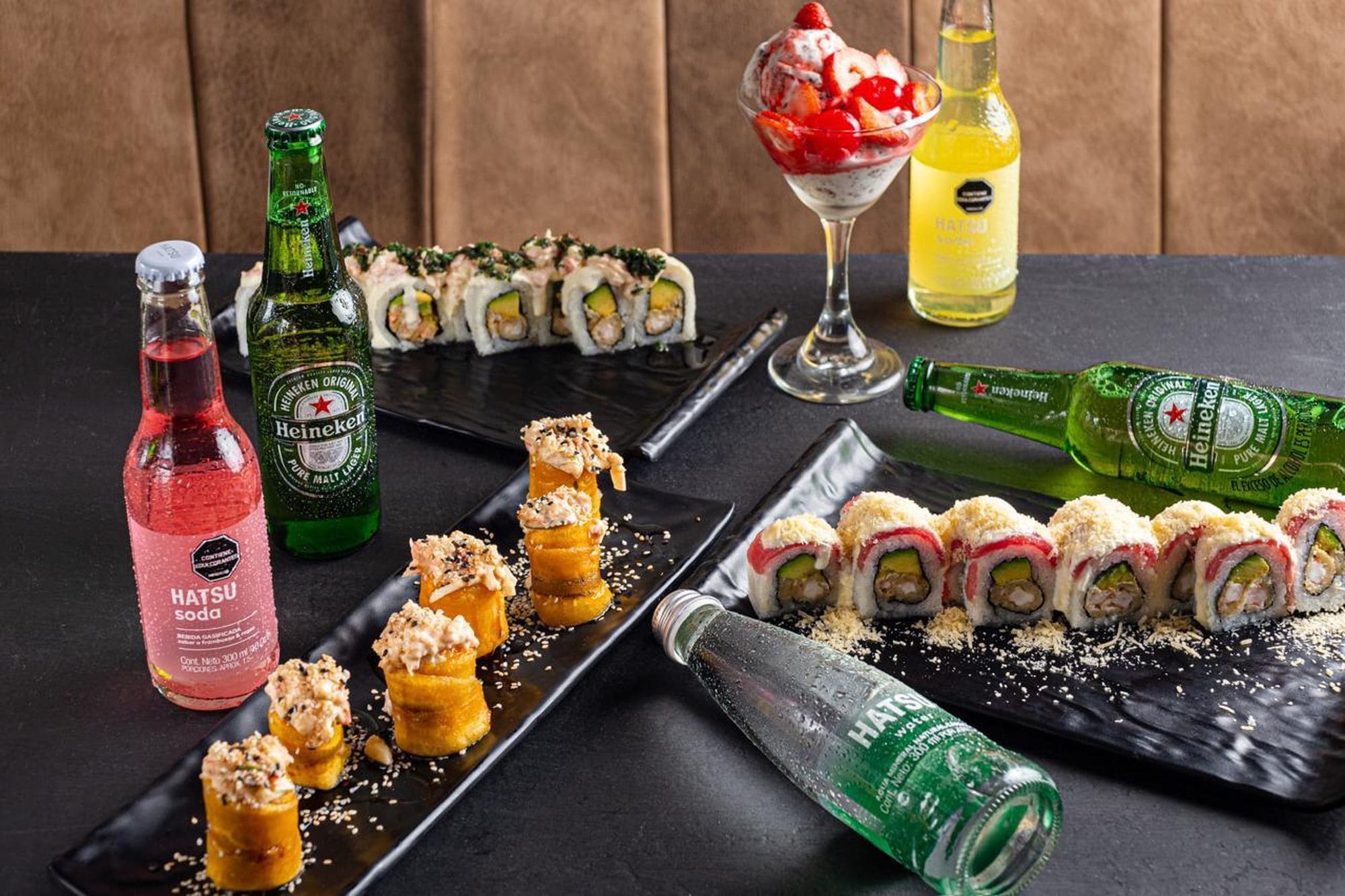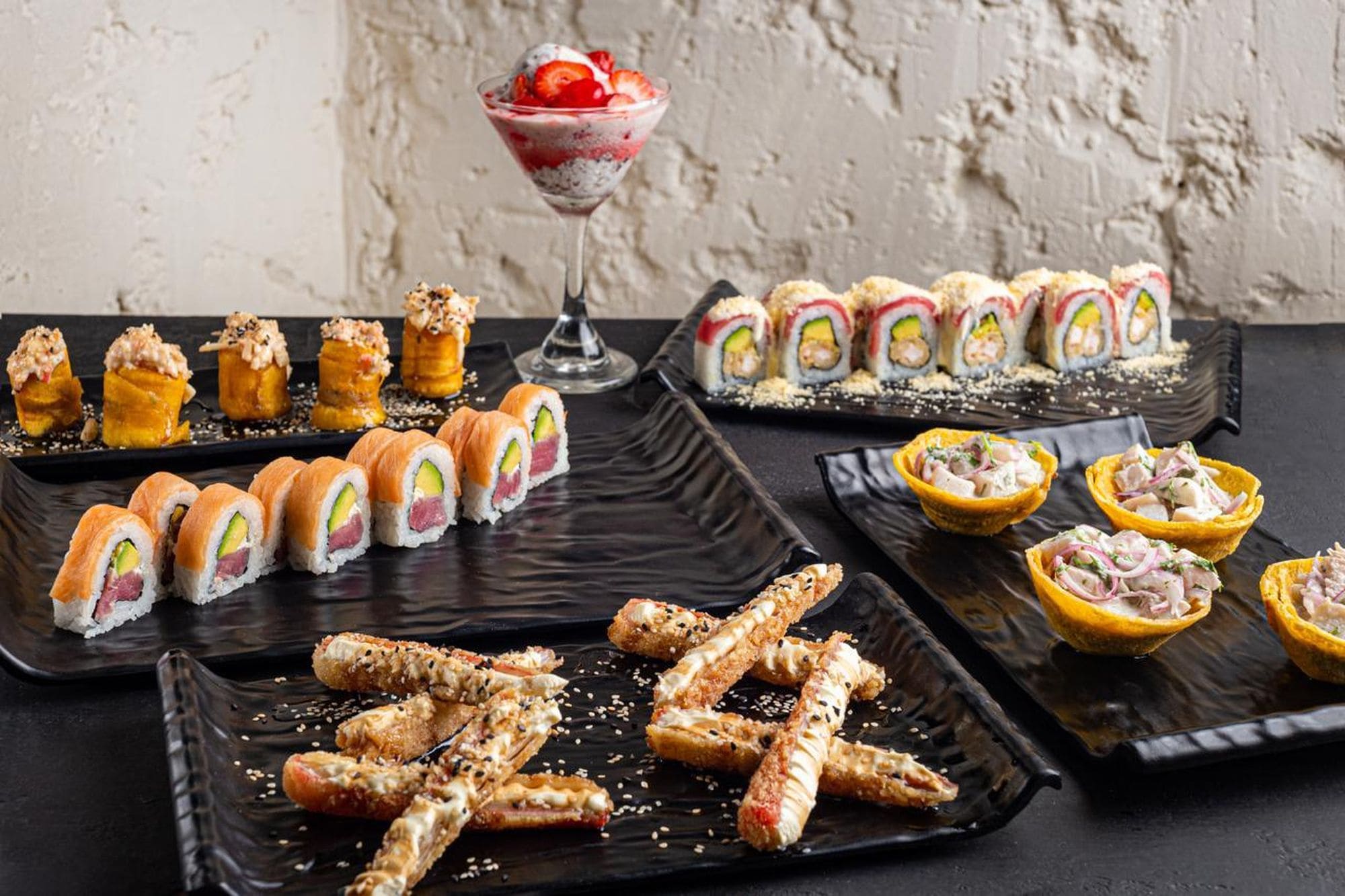 - Maduritos rellenos: Rollos de platano maduro, relleno de queso crema, coronado con pasta dinamita, bañado en salsa anguila, y semillas de ajonjoli.