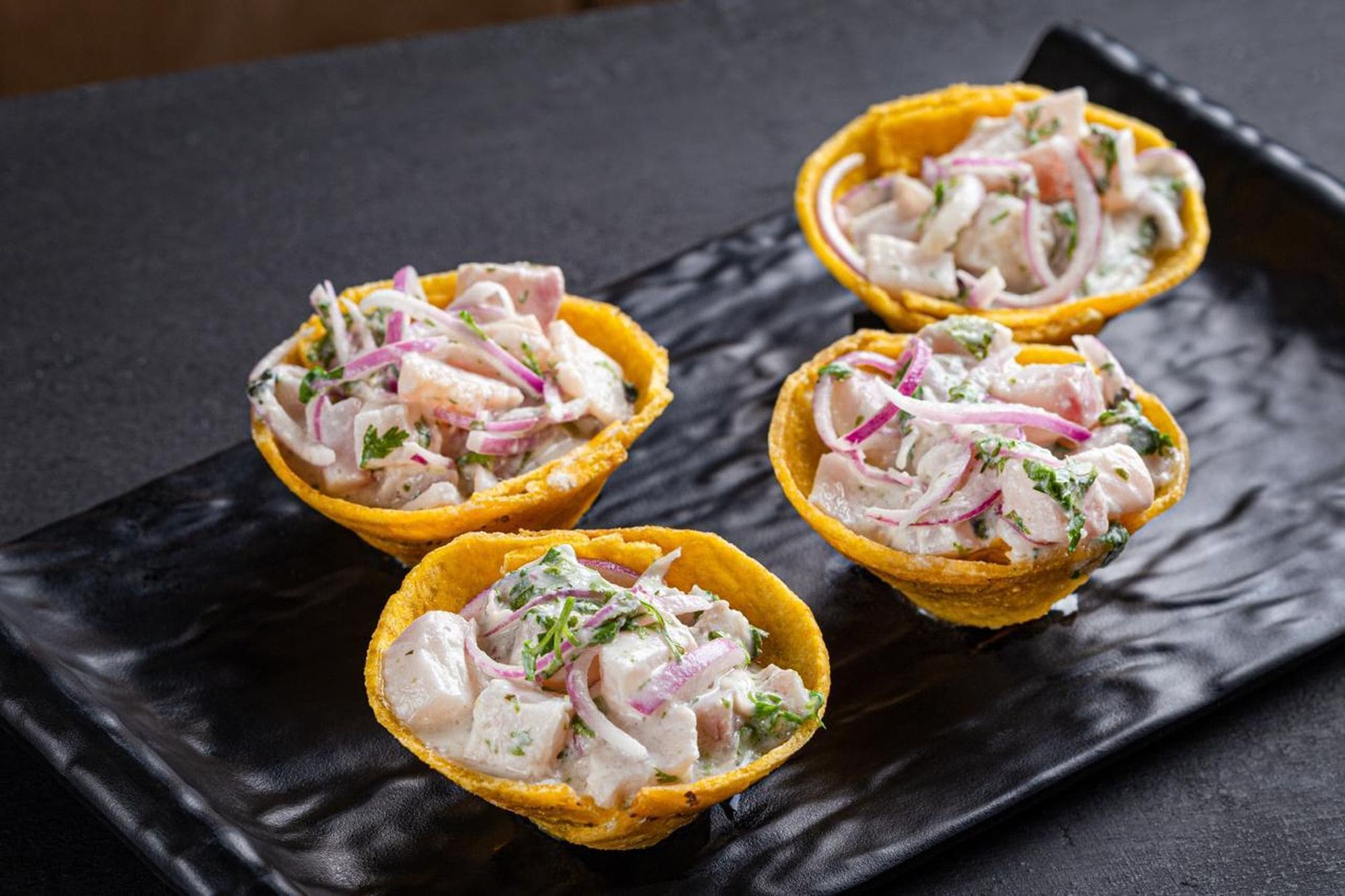 - Patacones acevichados: Copa crocante de patacones, relleno de ceviche de pescado blanco.