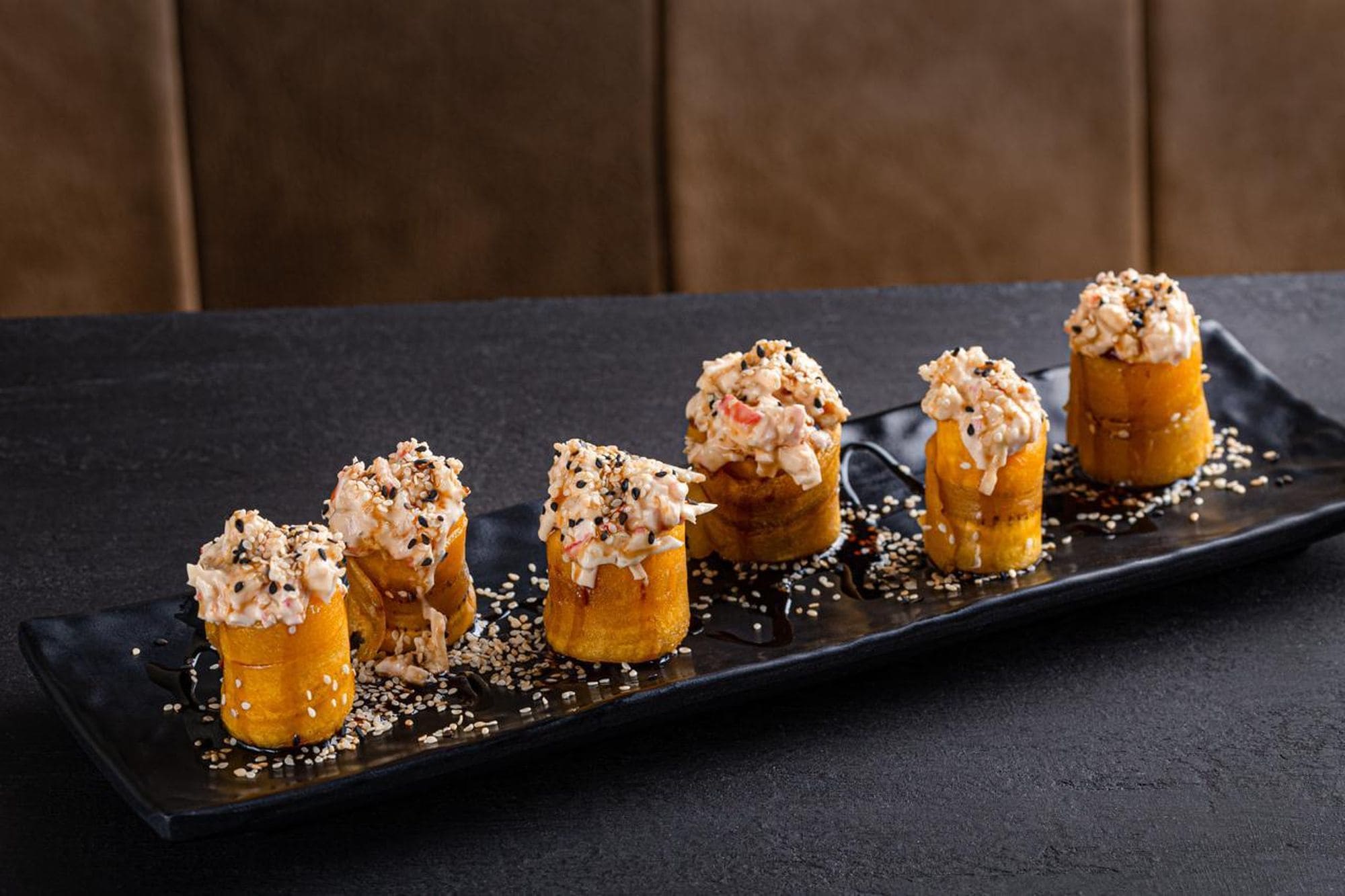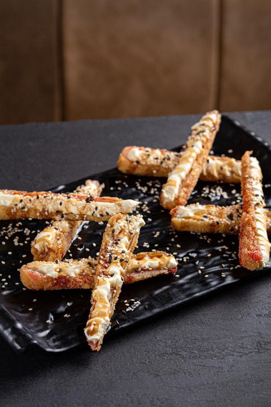 - Kanikama premium: Kanikama de pulpa de cangrejo tempura, rellenos de queso crema, bañado en salsa anguila y semillas de ajonjoli.