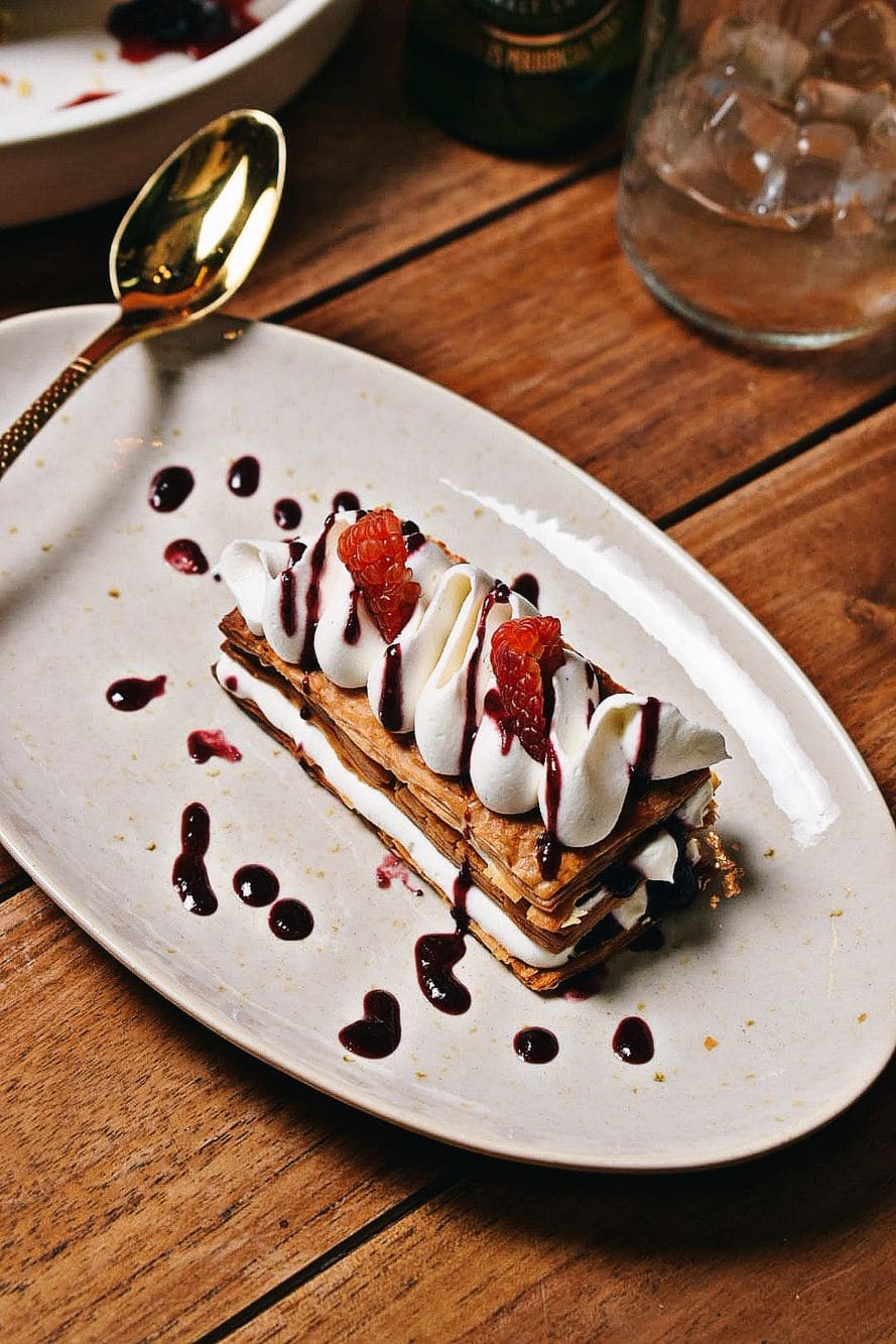 - Mil hoja frutos rojos: Delicadas capas de hojaldre finamente caramelizado, crujiente y ligero, intercaladas con una mermelada artesanal de frutos rojos de sabor intenso y ligeramente ácido. Se complementa con una suave crema chantilly perfumada con vainilla, que aporta equilibrio y elegancia en cada bocado. Coronado con frambuesas frescas que realzan su frescura y acidez natural, este postre es una armonía perfecta entre textura, dulzor y contraste.