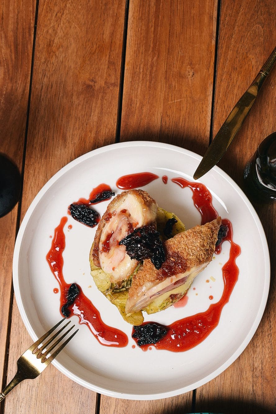 - Cordon blue: Una joya dorada que seduce desde el primer vistazo: el cordon bleu, crujiente por fuera y jugoso en su interior, libera lentamente su relleno fundido de queso y jamón, mientras se baña en una irresistible salsa de miel de naranja que equilibra lo dulce y lo cítrico con una elegancia envolvente. Encima, los fritos rojos aportan un toque crocante y atrevido que despierta cada bocado. A su lado, las papas criollas, perfectamente doradas y especiadas, se mezclan con la frescura herbal del pesto y la intensidad del parmesano rallado, creando una guarnición que no acompaña… sino que conquista.