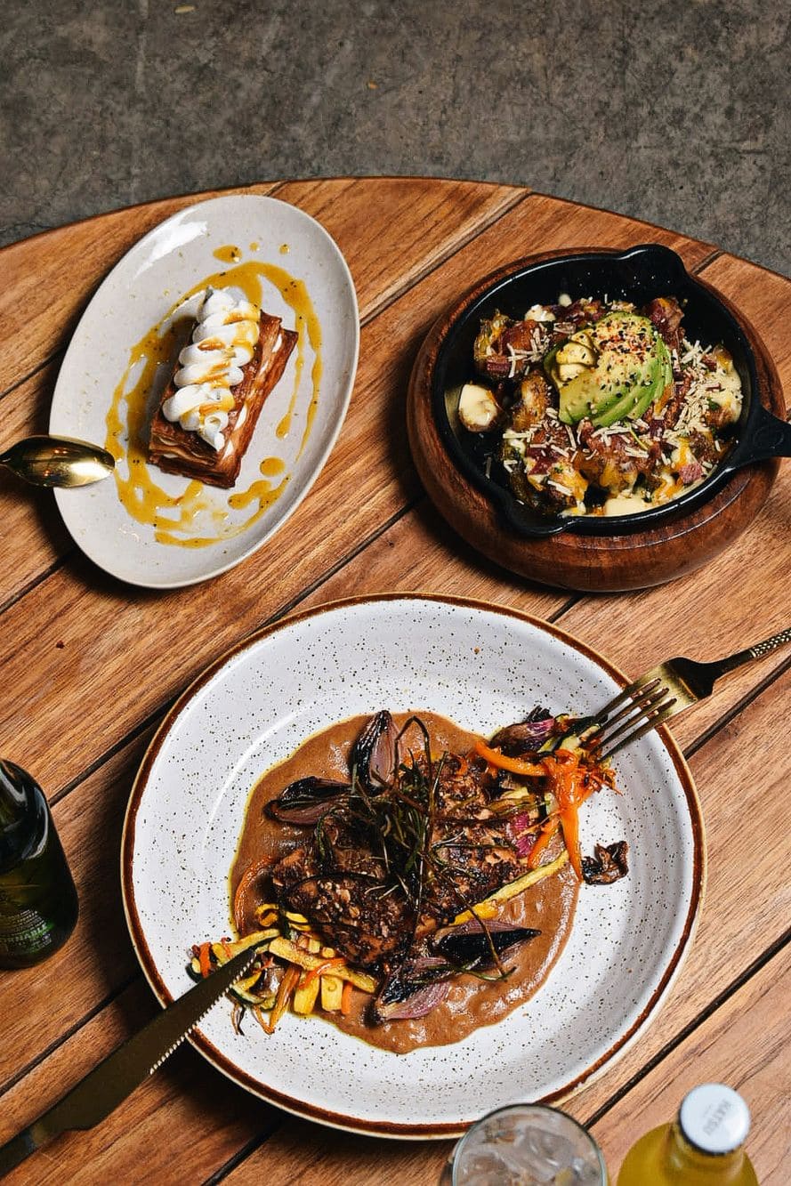 - Mil hoja imperial: Capas finas de hojaldre dorado y crujiente, ensambladas con una sedosa crema diplomática de chocolate blanco y vainilla real, que aporta profundidad, suavidad y un dulzor elegante. Se intercala con un curd de maracuyá vibrante y ligeramente ácido, generando un contraste fresco que equilibra perfectamente cada bocado.