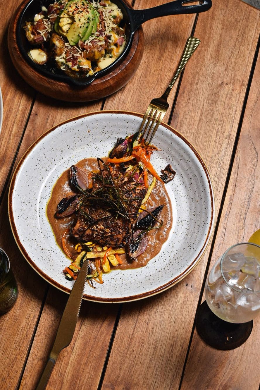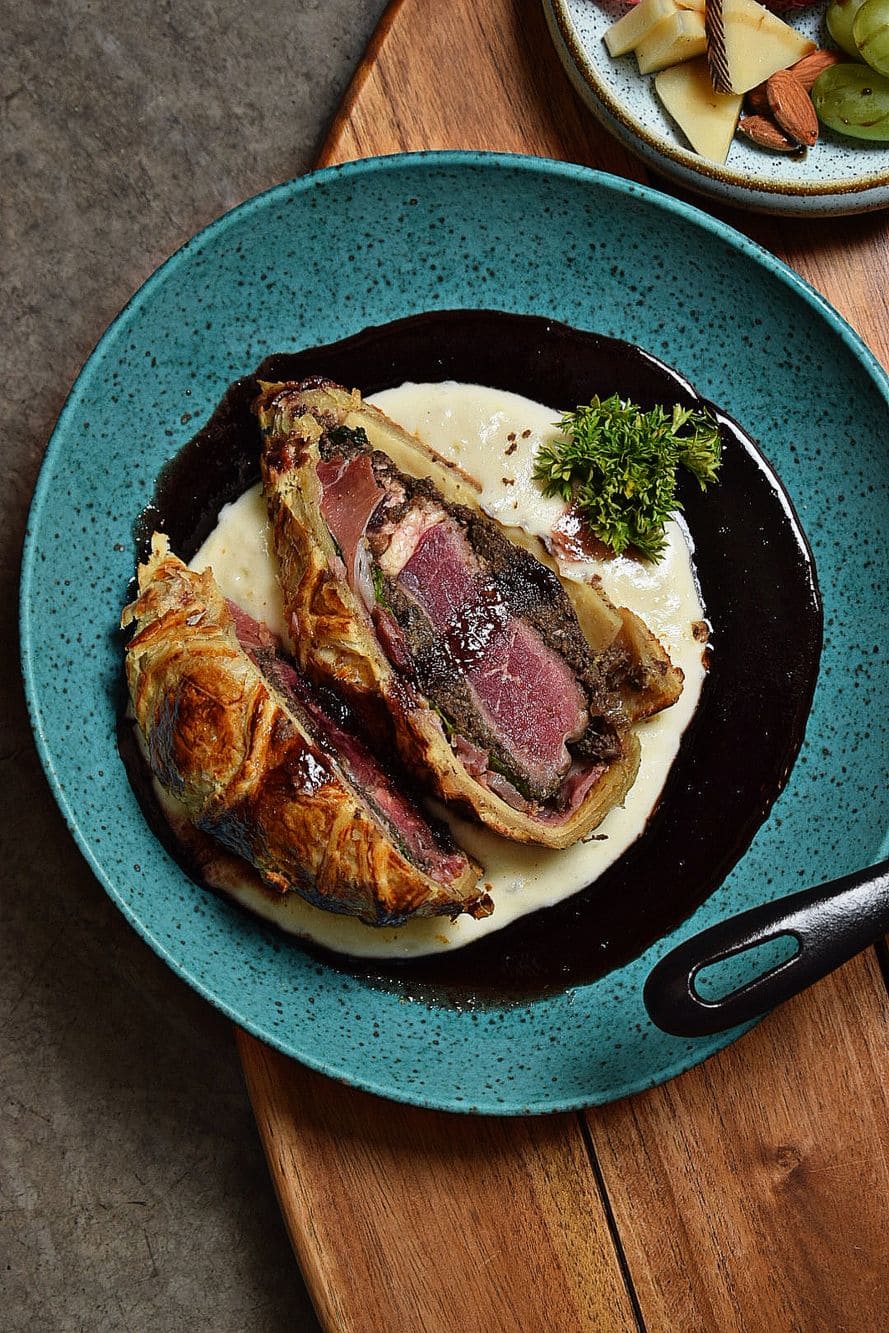 - Beef wellington: Dorado a la perfección, cruje delicadamente al primer corte para revelar un corazón de carne jugosa y rosada, sellada en su punto exacto. La duxelle de hongos intensifica cada nota terrosa, abrazando el filete con una profundidad que seduce sin esfuerzo. Lo baña una seductora reducción de vino tinto y frutos salvajes, donde lo ácido y lo dulce se entrelazan en una danza intensa que realza cada fibra de la carne, dejando un rastro elegante y ligeramente atrevido en el paladar. A su lado, un cremoso de papa y queso, suave y envolvente, se derrite como un susurro cálido que equilibra la potencia del plato, aportando confort y sofisticación en cada cucharada.