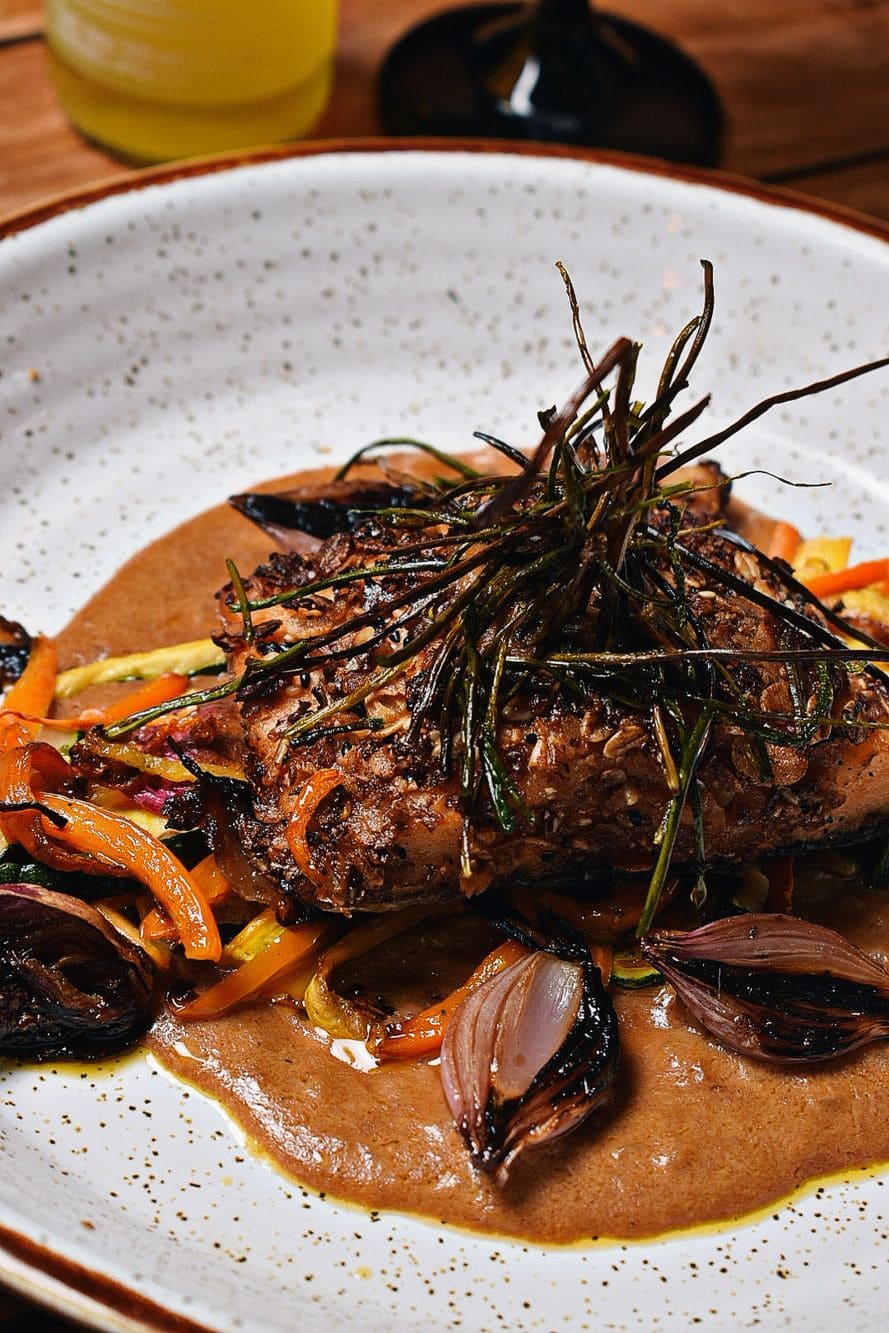 - Salmón: Un bocado que despierta todos los sentidos: el salmón, jugoso y delicadamente sellado, se cubre con una costra irresistible de granola de coco que aporta un crujiente exótico y ligeramente dulce, creando un contraste perfecto con su interior suave y sedoso. Sobre él, cae una seductora salsa teriyaki, brillante y envolvente, que mezcla notas dulces y saladas en una caricia intensa que resalta la frescura del pescado sin opacarlo. Acompañado de vegetales frescos salteados al punto exacto, aún vibrantes y llenos de vida, cada bocado se convierte en un equilibrio entre lo crocante, lo jugoso y lo aromático.