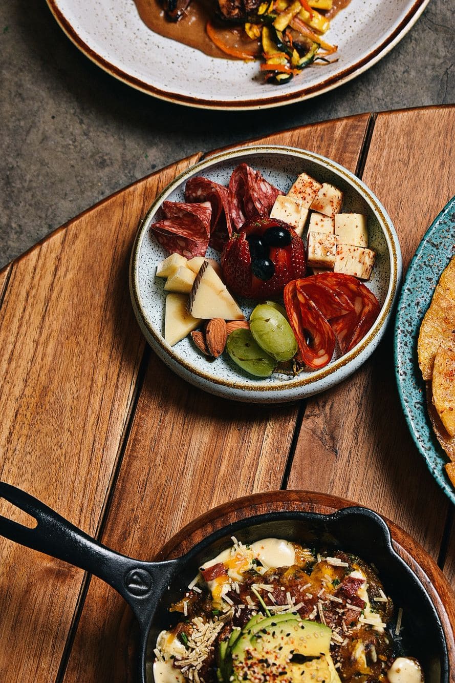 - Tabla de charcutería: Selección de quesos y jamones finos acompañados de frutos secos, pan artesanal y mermelada de temporada. Perfecta para compartir