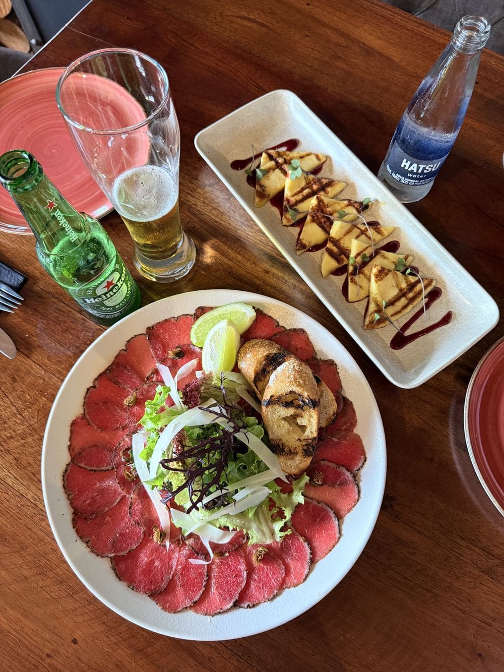 - Carpaccio de res: Finas láminas de res con queso parmesano, mezclum fresco, alcaparras, balsámico, sal, pimienta y un toque de limón.