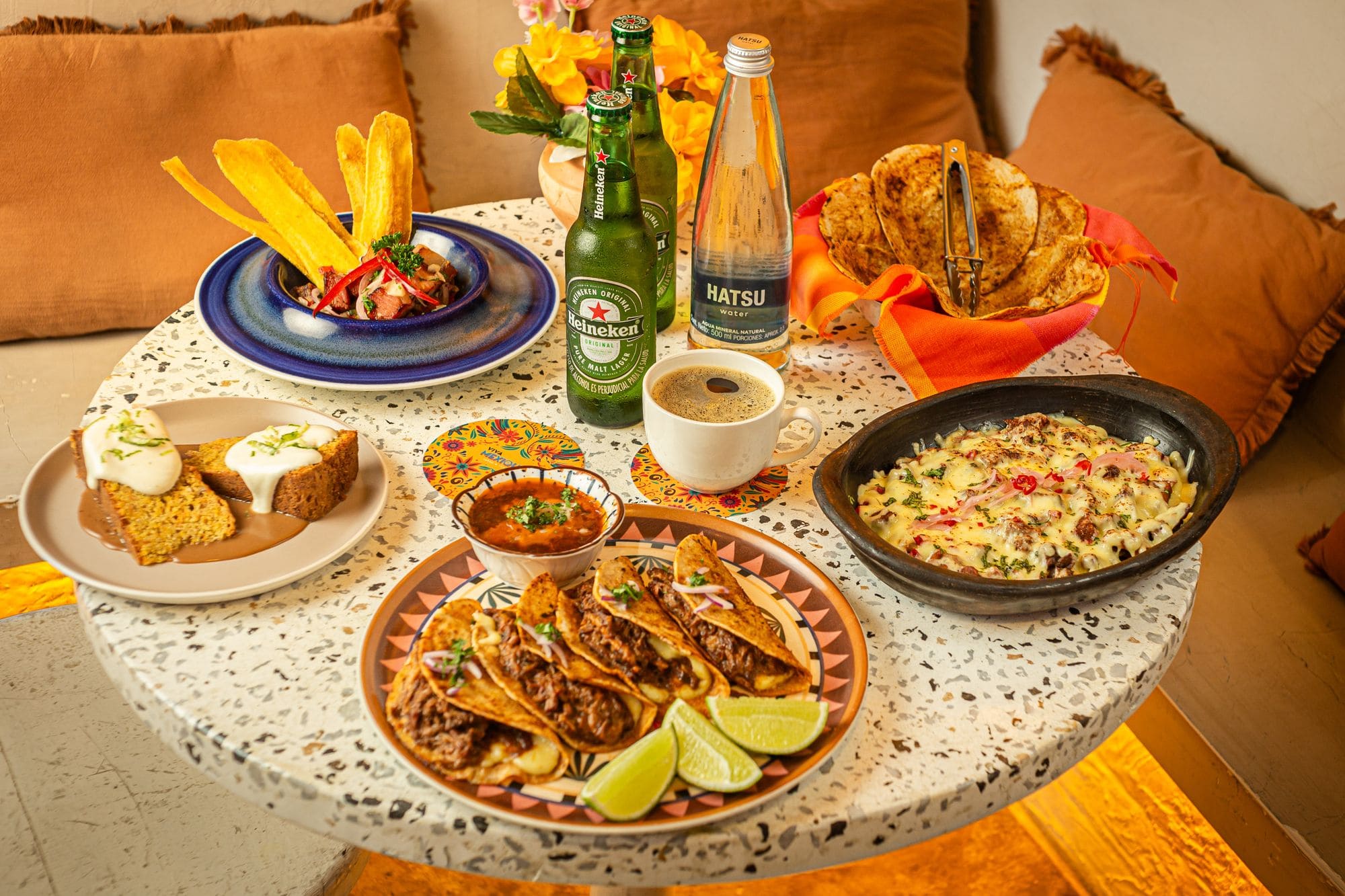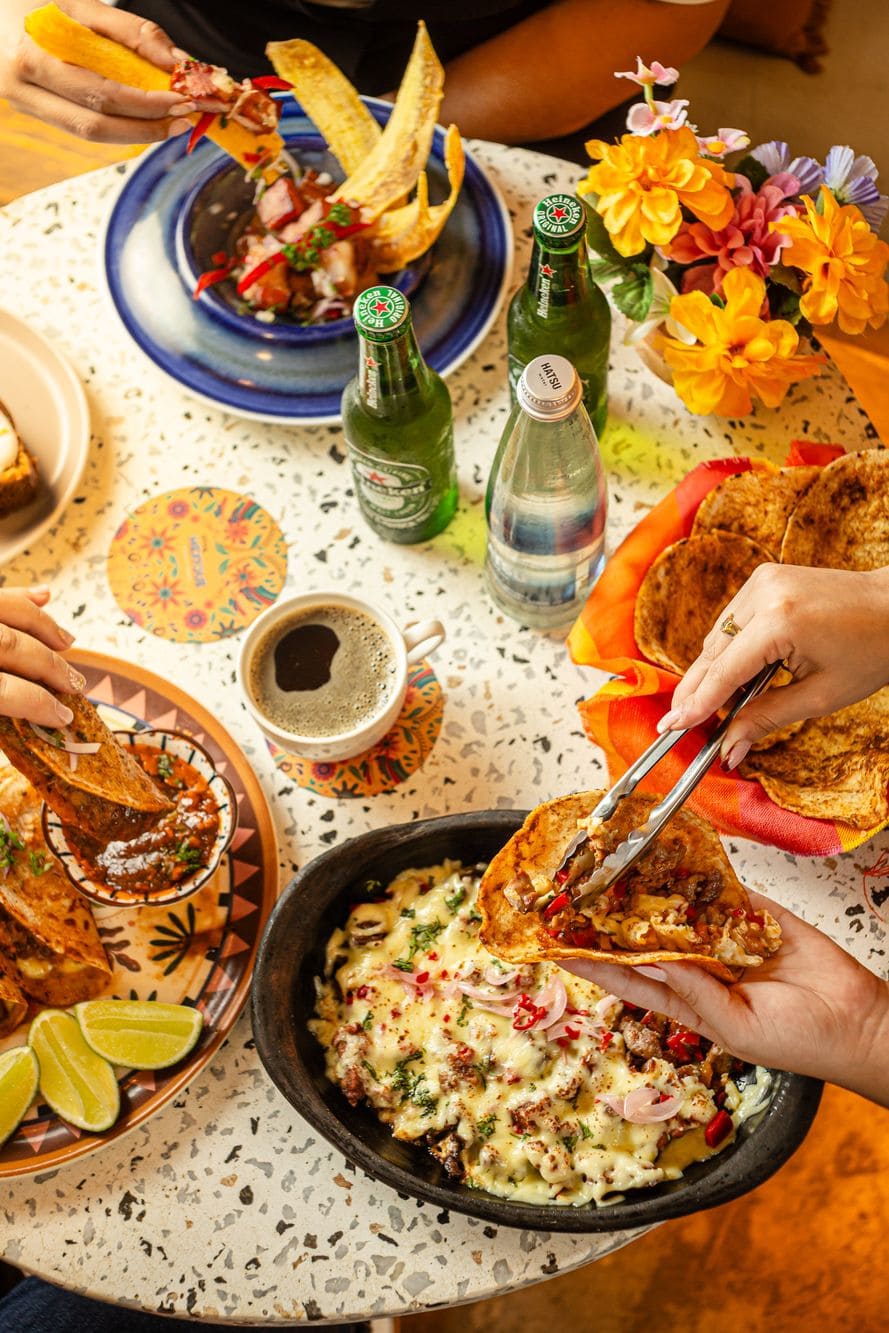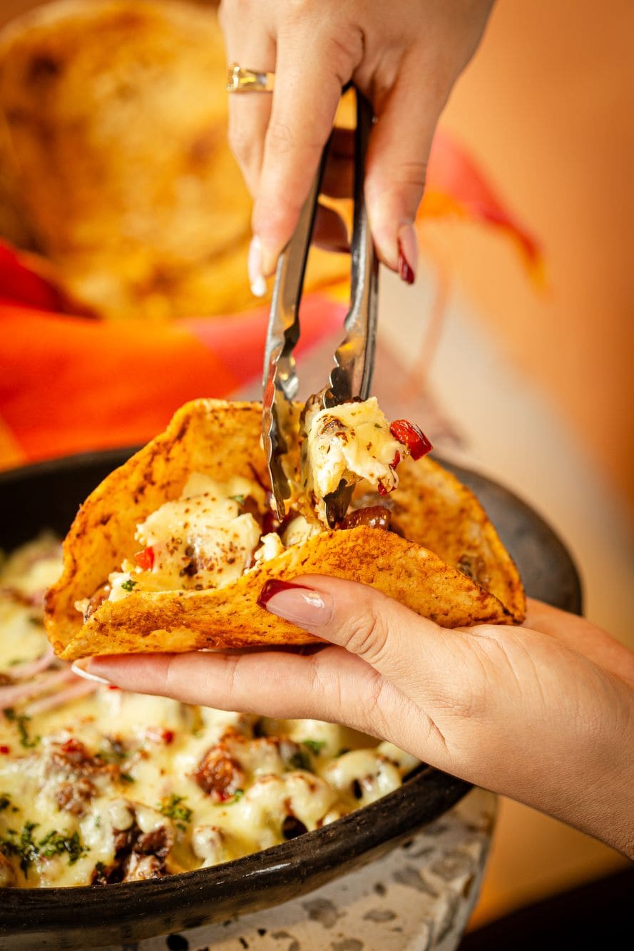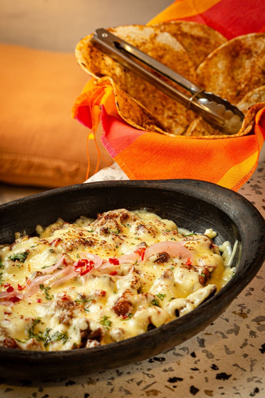 - Alambre de res: Mezcla de res, tocino y chorizo, salteada con pimentones y cebolla, finalizada con queso fundido y servida con tortillas de maíz.