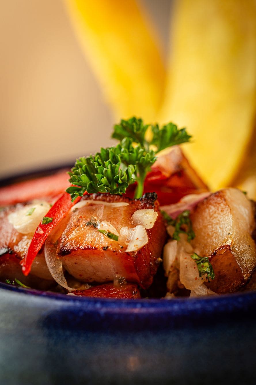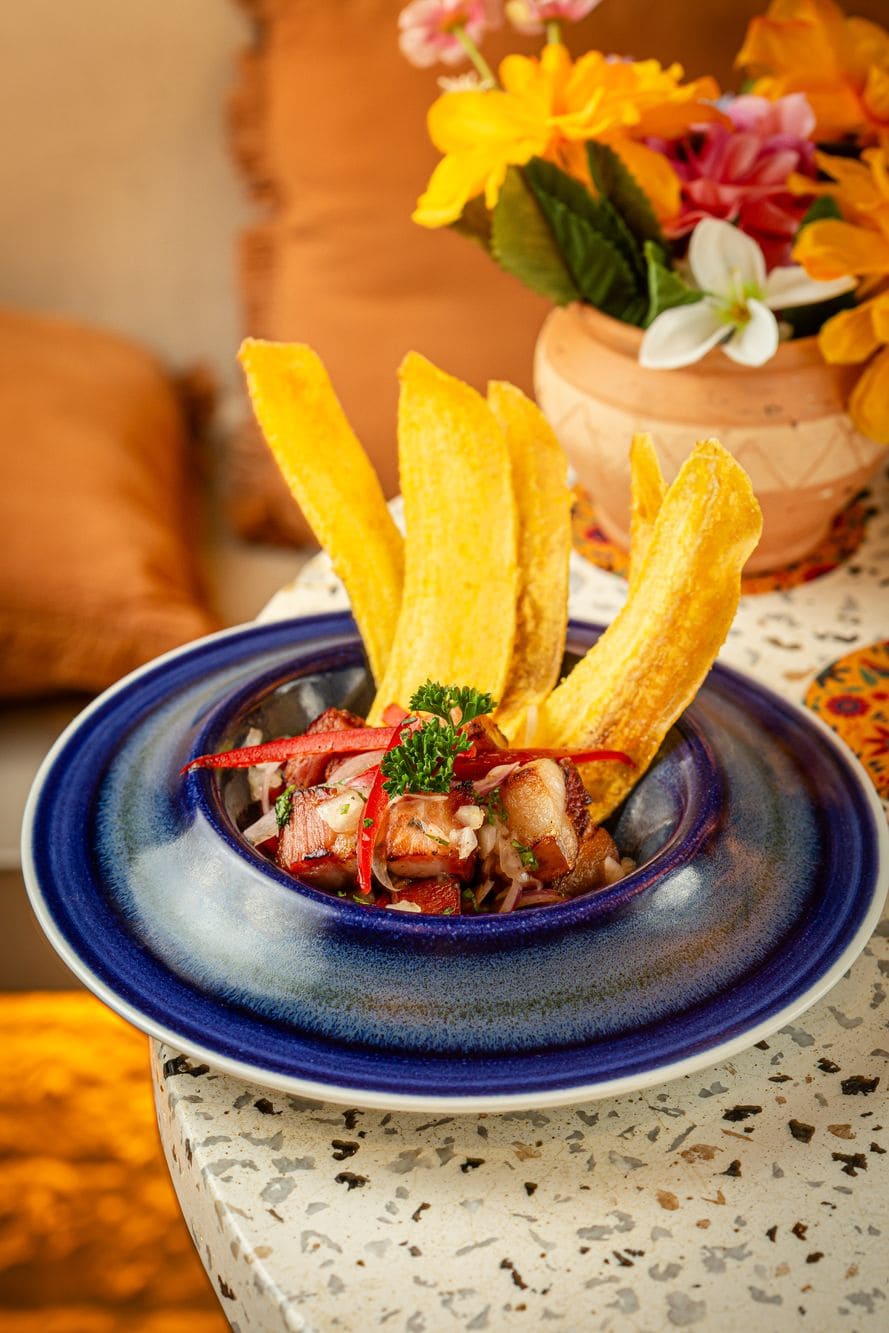 - Ceviche de chicharrón: Tocino ahumado, bañado de una exquisita mezcla de limón y vegetales frescos, acompañado de chips de plátano.