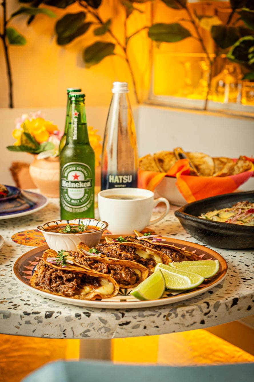 - Tacos de birria: 4 tacos de birria, carne de res lentamente cocinada en adobo de chiles y especias, servida en tortilla dorada al consomé y acompañada de su caldo aromático.