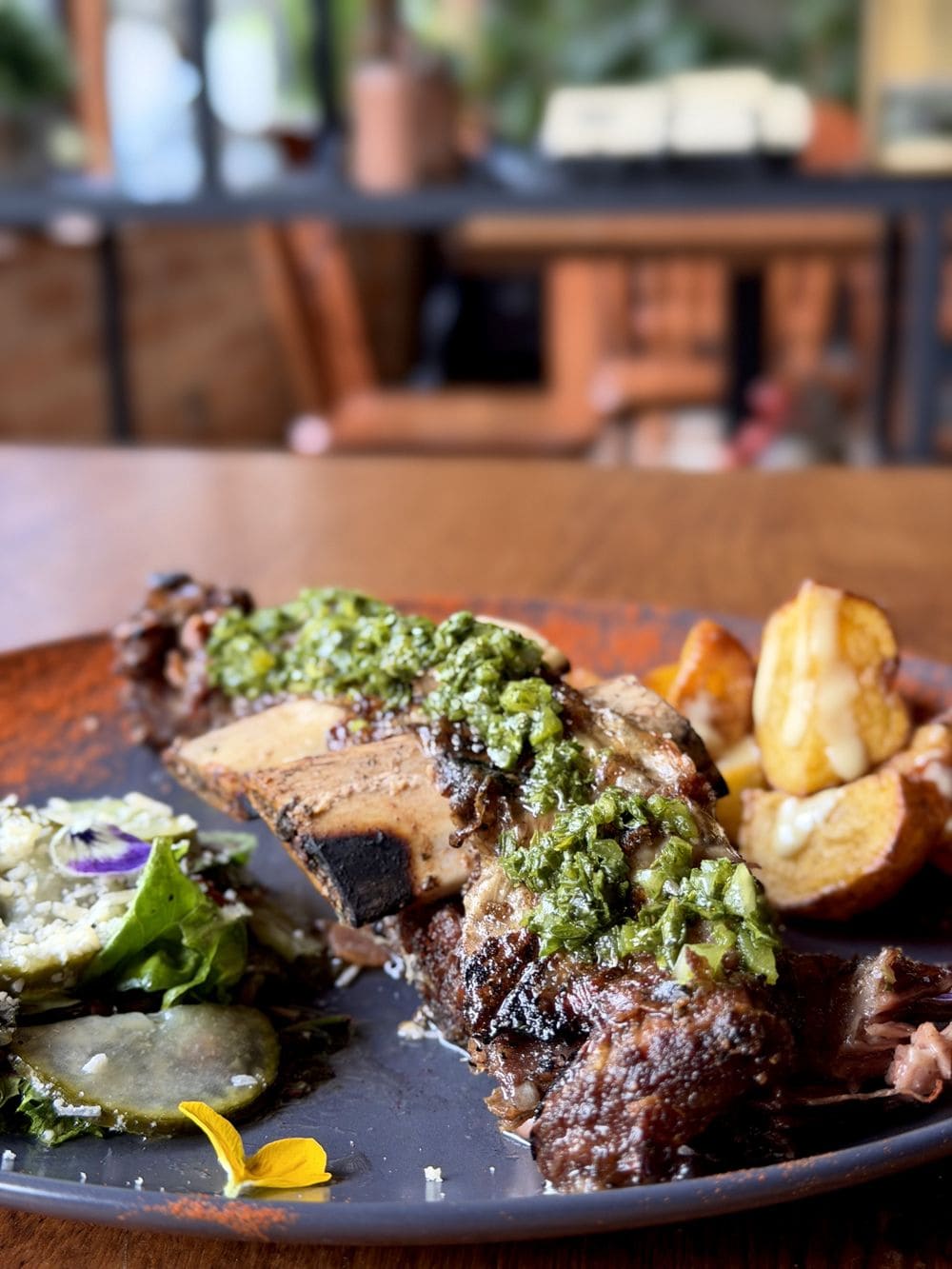 - Asado de tira: Jugoso Asado de tira (corte suave con hueso de costilla) acompañado de papas criollas con alioli de ajo y ensalada fresca de la huerta (pepinillos, mézclum orgánico, tocineta y parmesano).