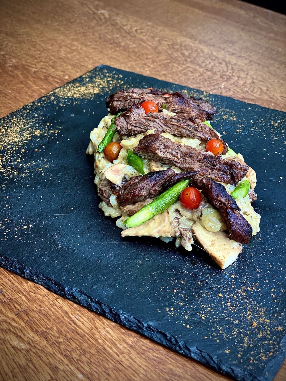 - Cremoso de oryza: Lomo fino parrillada sobre arroz cremoso de variedad de quesos acompañado de hongos nattivos, espárragos y explosivos tomates perla. Sustituye proteina por portobellos parrillados.