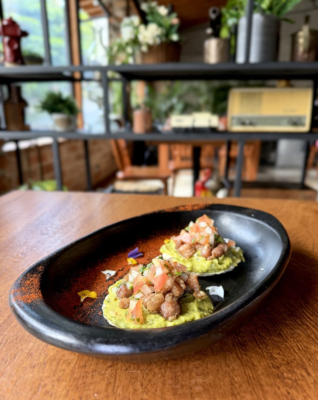 - Arepas de yuca: Arepa artesanal de yuca con cremoso guacamole artesanal, coronada por una panceta de ahumada durante y pico de gallo