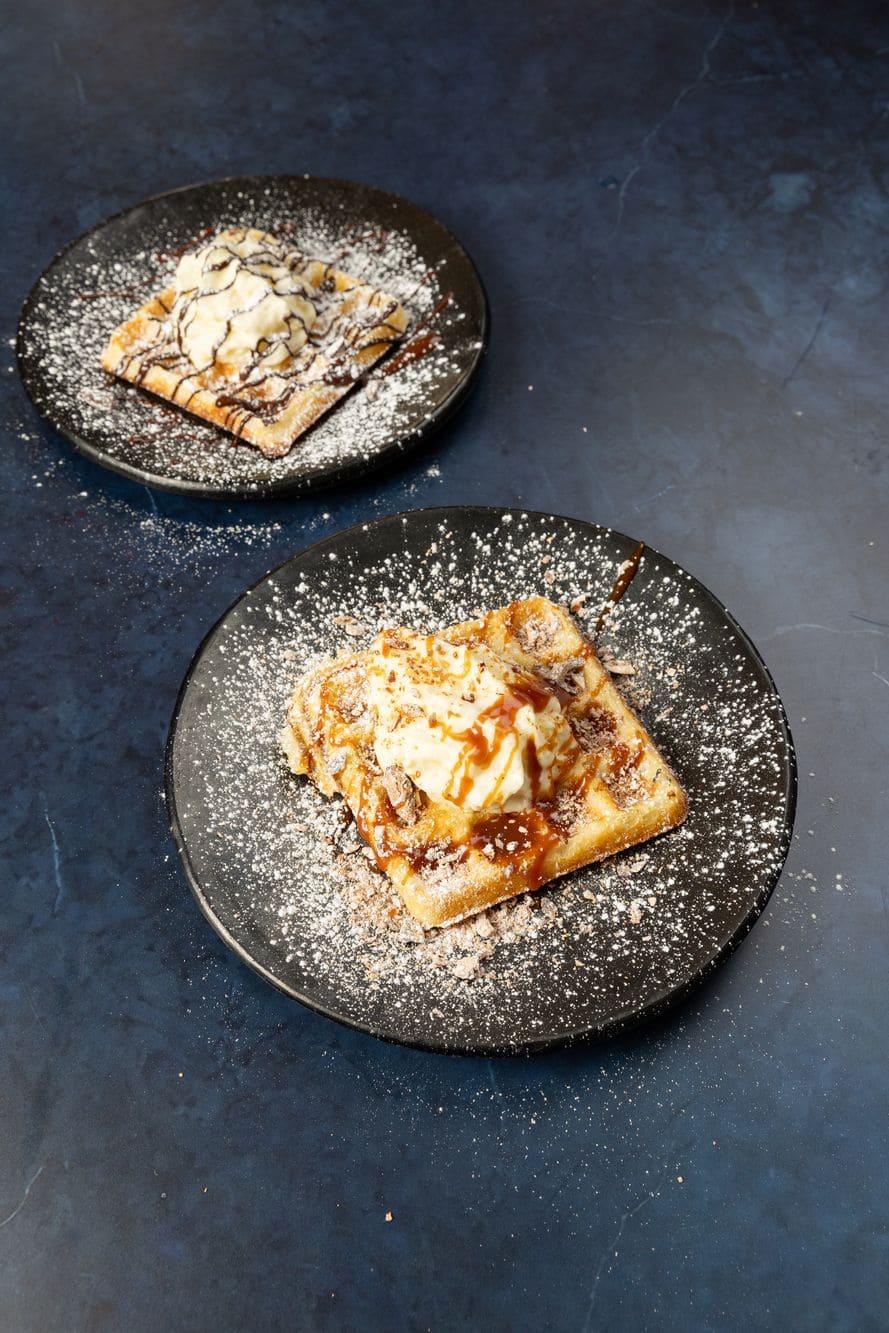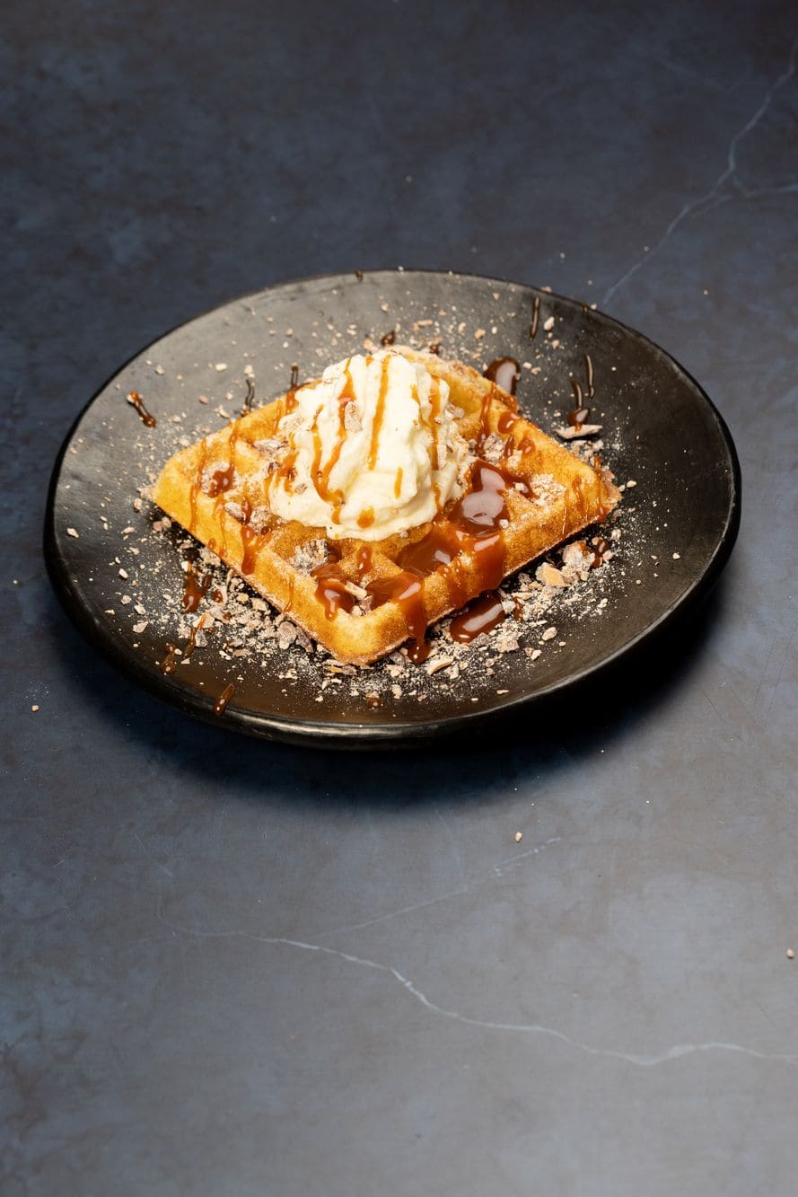 - Waffle Belga de Bruselas, caramelo con sal marina, almendras caramelizadas y su crema Chantilly.
