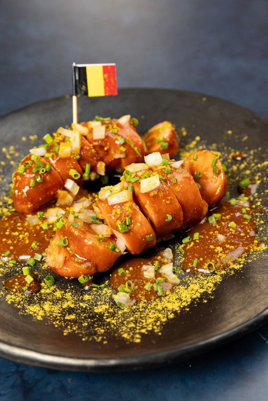 - Currywurst: 2 salchichas berlinesas bañadas en salsa curry ketchup, decorada con cebolla y cebollín.
