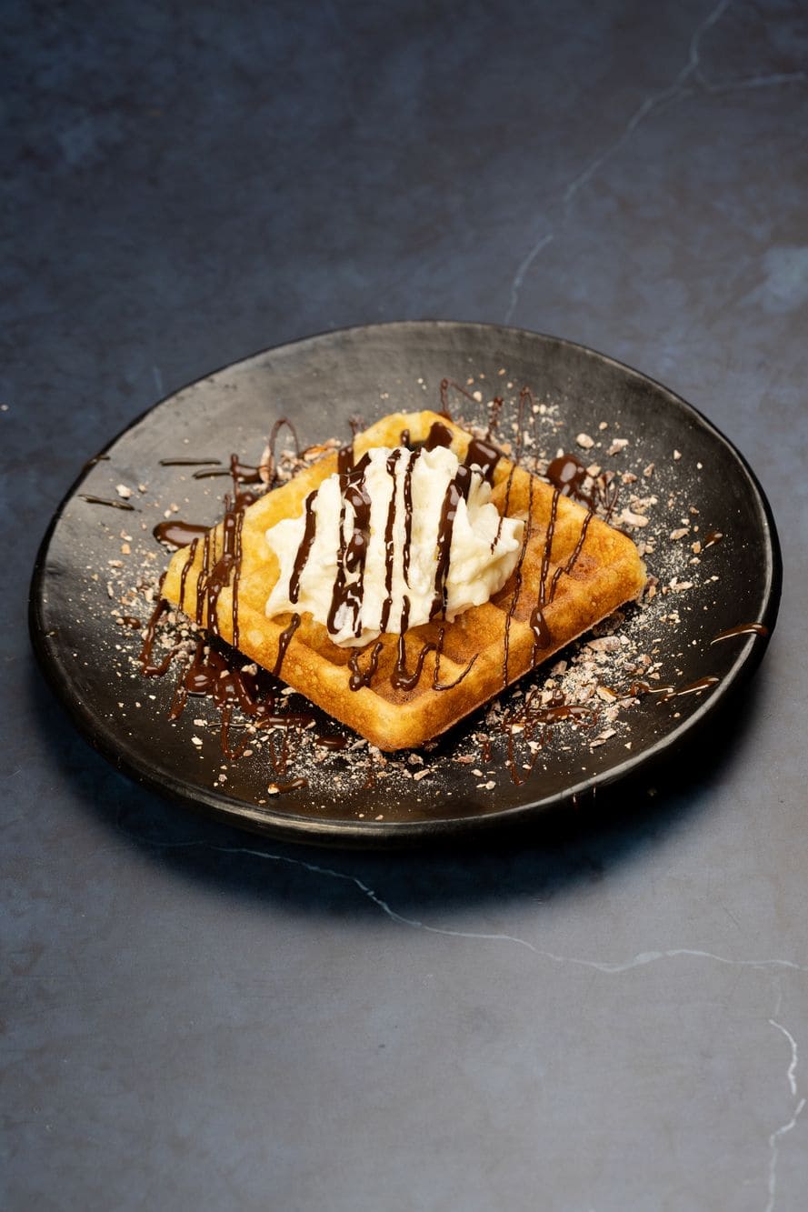 - Waffle Belga de Bruselas con sus dos chocolates y crema Chantilly.