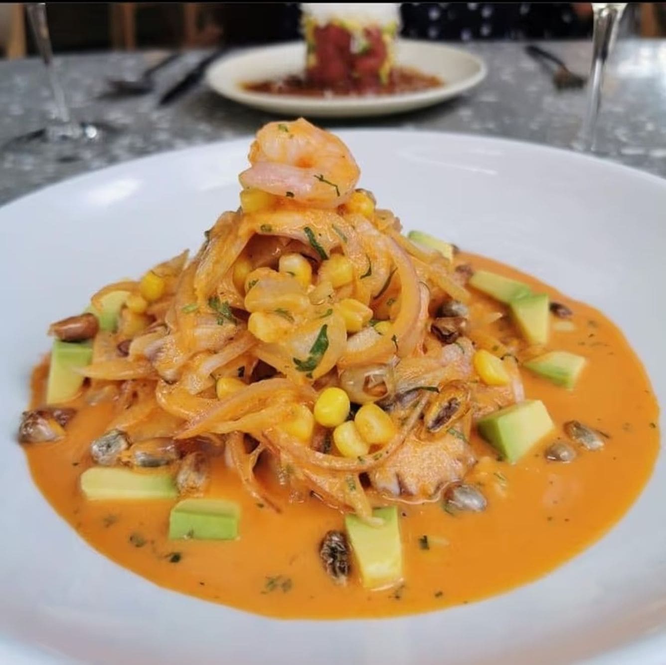 - Ceviche piqueo: Pescado, pulpo, camarón con maíz tierno, maíz cancha, aguacate a base de leche de tigre y cremosa suave de pimentón.