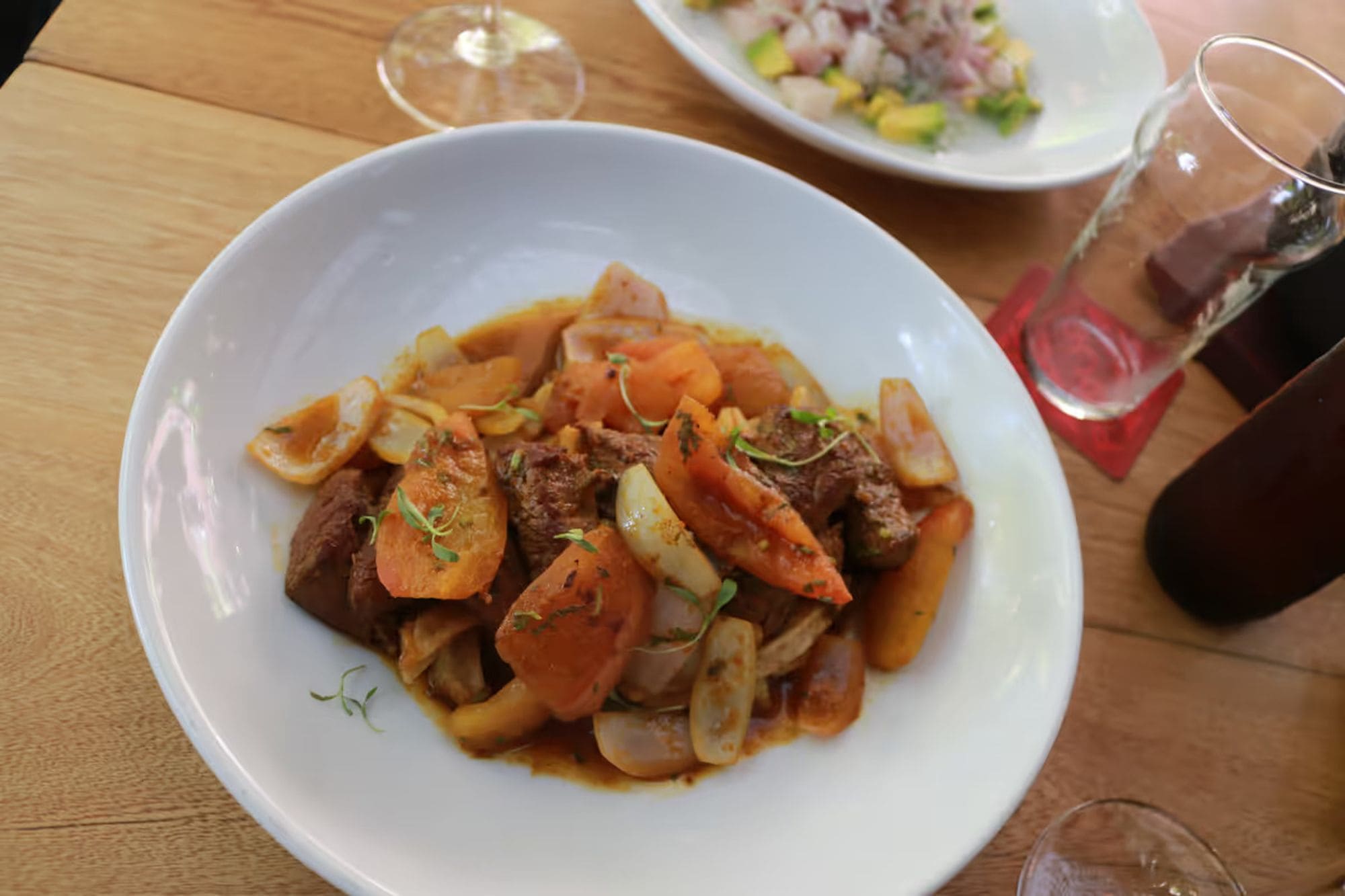- Lomo saltado: Julianas de solomito salteadas con cebolla, tomate, cilantro y pasta de ají amarillo sobre bastones de papa.