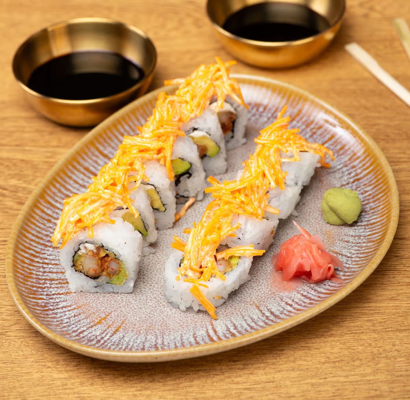 - Dinamita roll: Maki relleno de langostino crocante, queso philadelpia y aguacate finalizado con salsa dimanita.