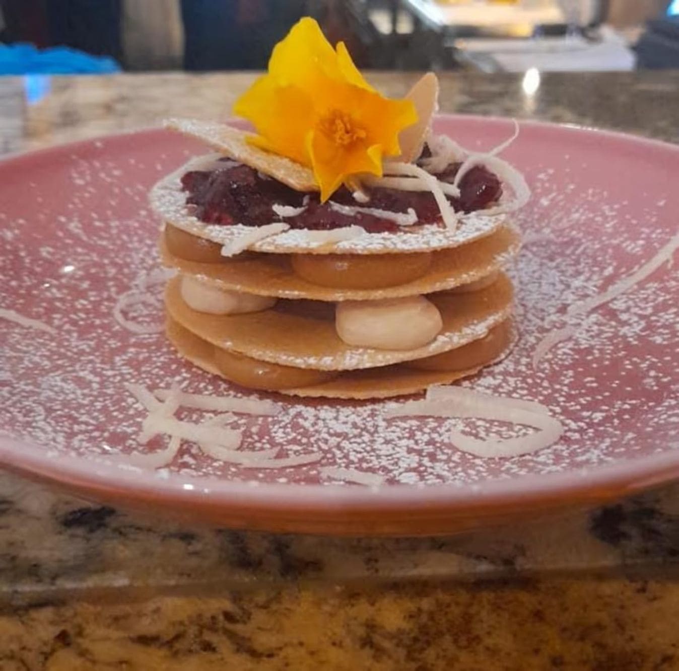 -Torre de oblea: Capas de oblea con arequipe, crema pastelera de avellanas y confitura de frutos rojos.