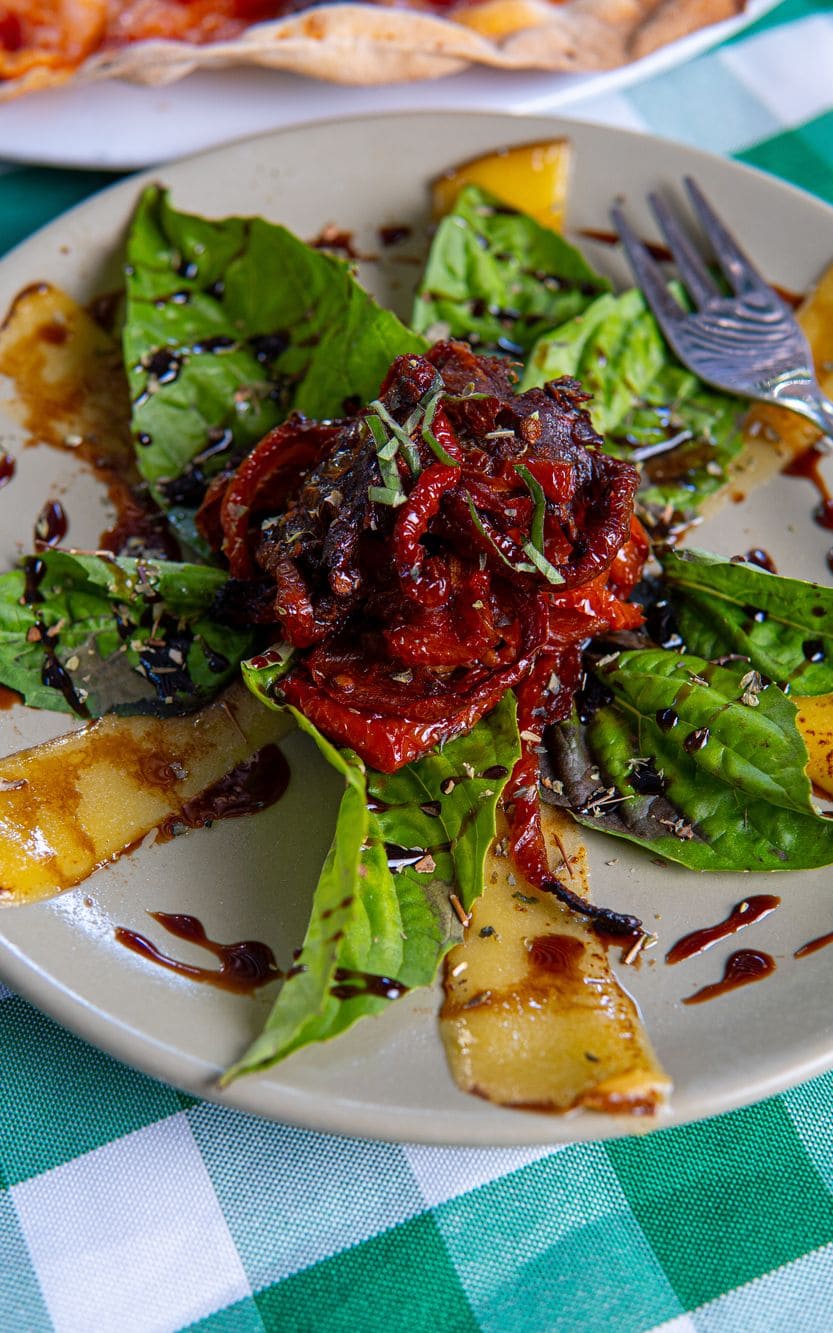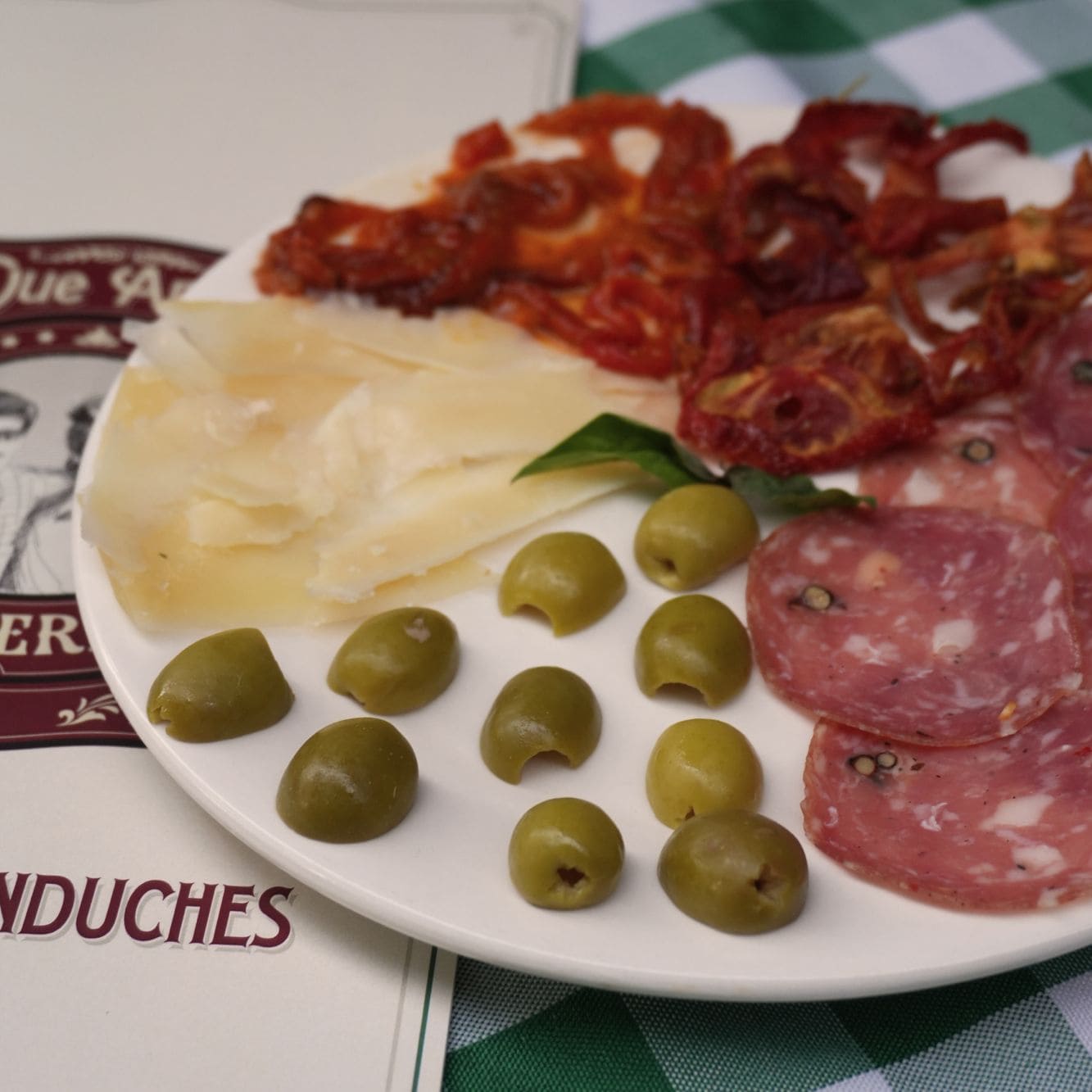 - Antipasto: Pimentones asados,aceitunas verdes, queso parmesano, tomates secos y lonchas de carne madurada u hongos salteados.