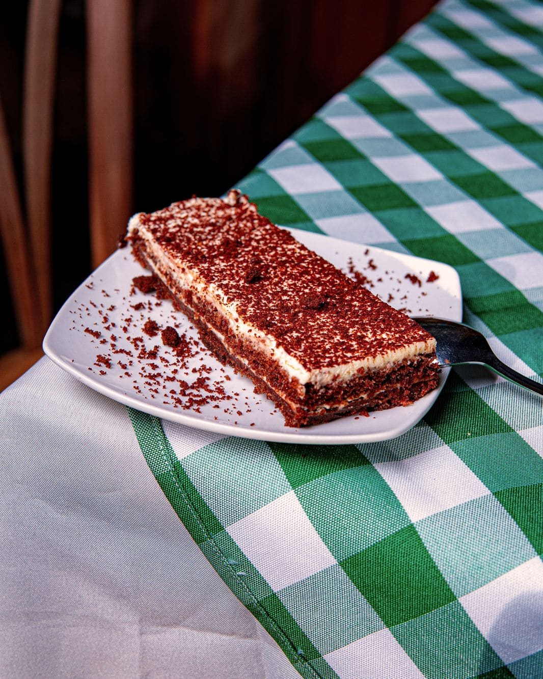 - Tiramisú: Finas capas de brownie bañadas en café con un toque de red label Johnnie Walker, rellenas en el centro con un ganache de chocolate amargo al 70% y cubiertas con una suave crema de leche mezclada con queso crema.
