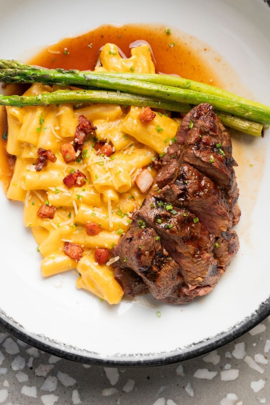 - Steak and cheese: Solomito de res a la parrilla, acompañado con macarrones en salsa de queso chedar, crocante de tocineta y espárragos parrillados.