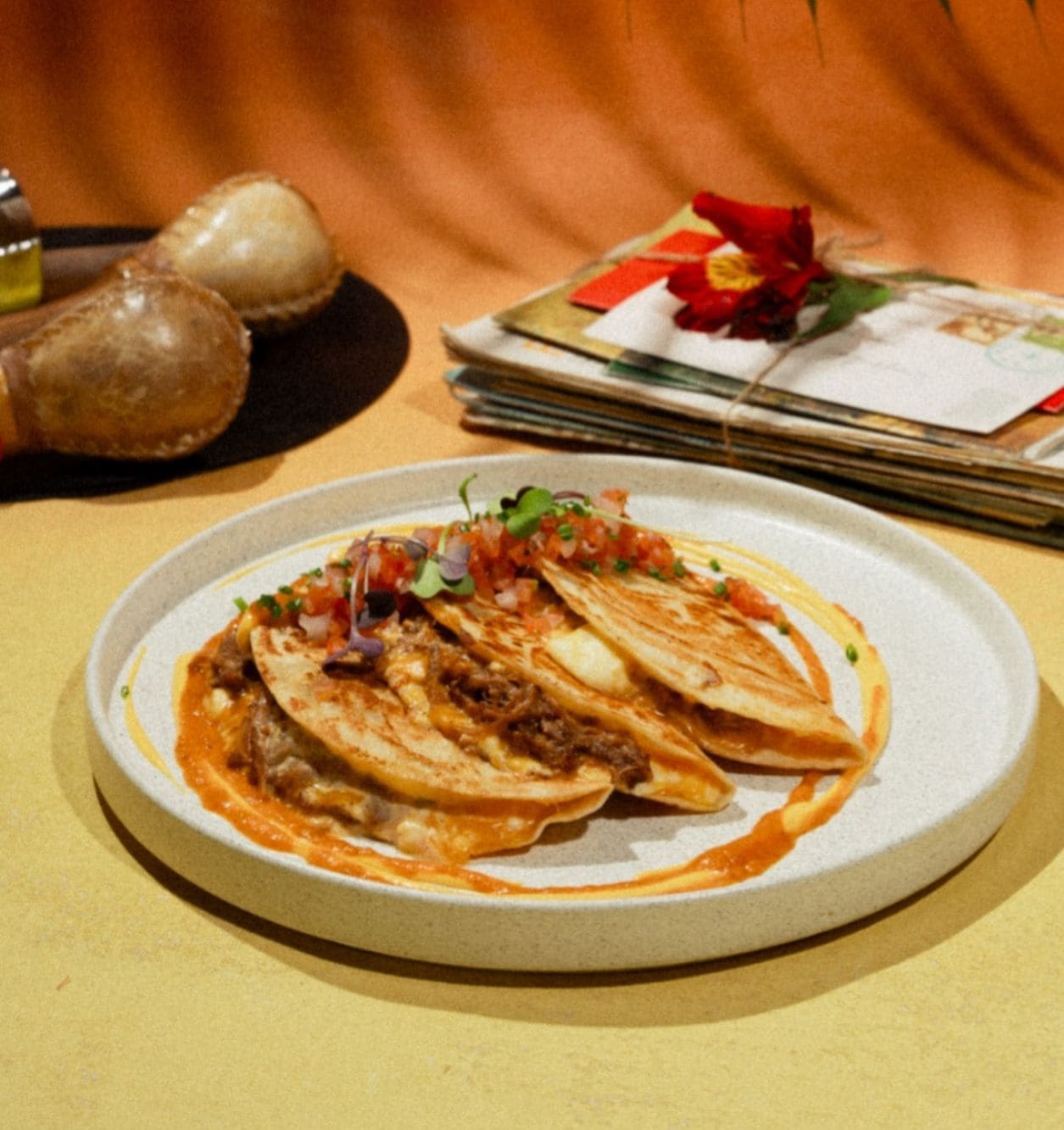 - Quesadilla posada: Tortillas de harina rellenas de carnitas, mix de quesos, salsa de queso chedar y salsa tatemada