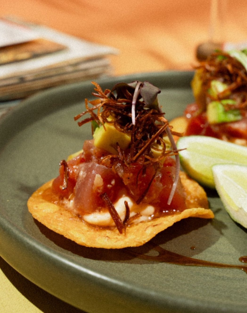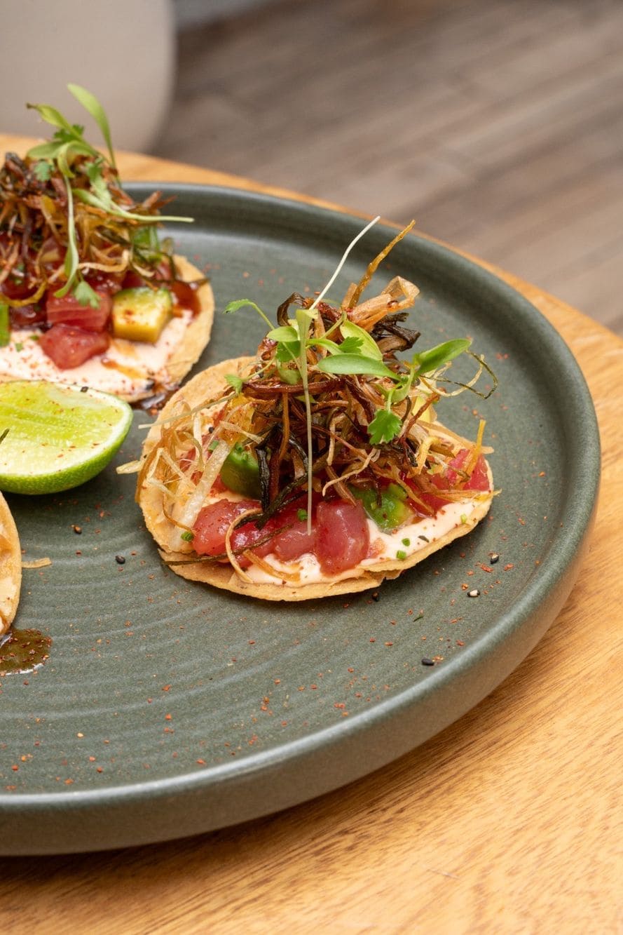 - Tostadas de atún: Tartar trufado de atún aleta amarilla, tortilla de maíz crocante, mayo sriracha, aguacate y puerro crocante