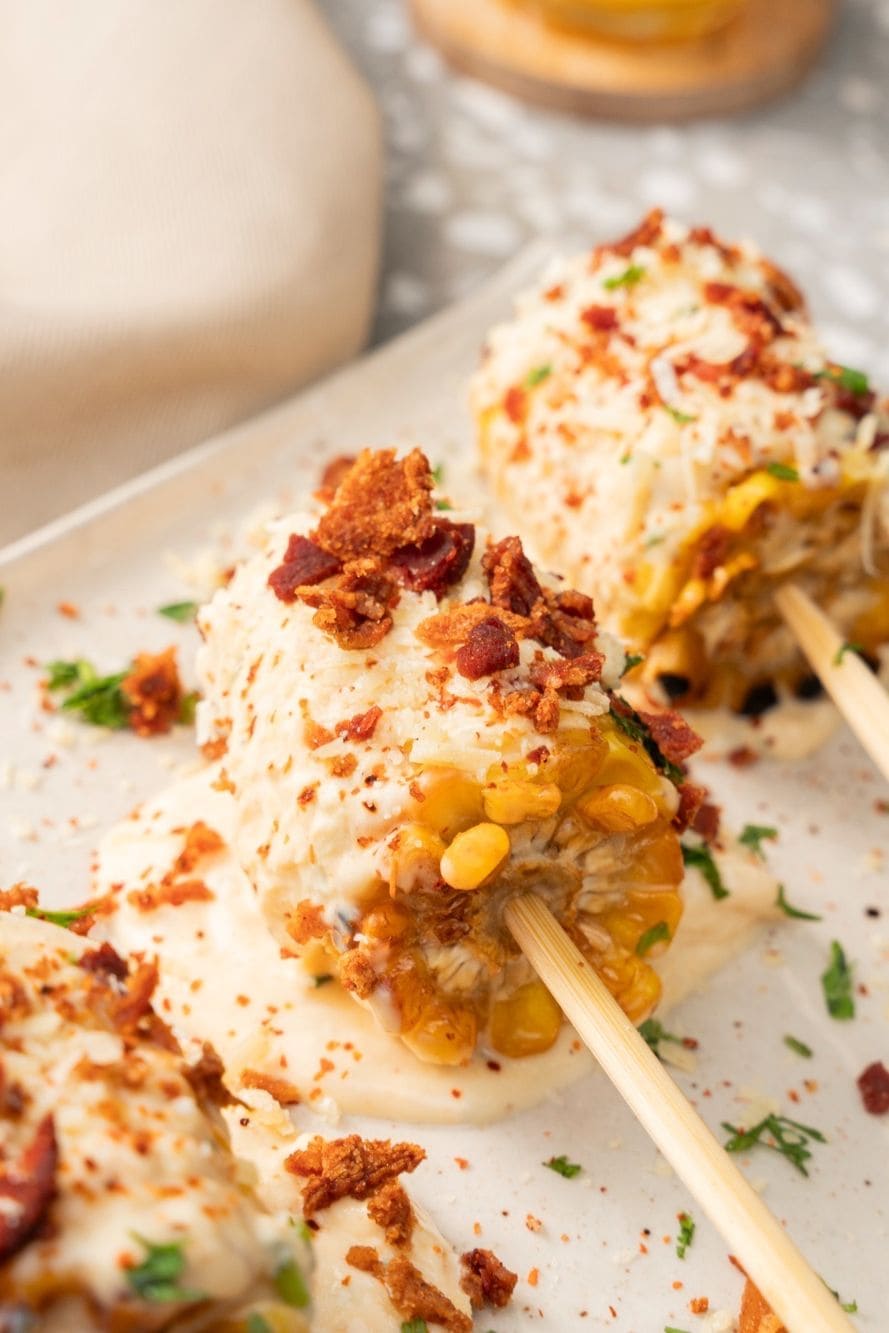 - Elotes despeinados: Mazorca dulce crocante, servida en cremosa de tres quesos, tajín y crocante de tocineta