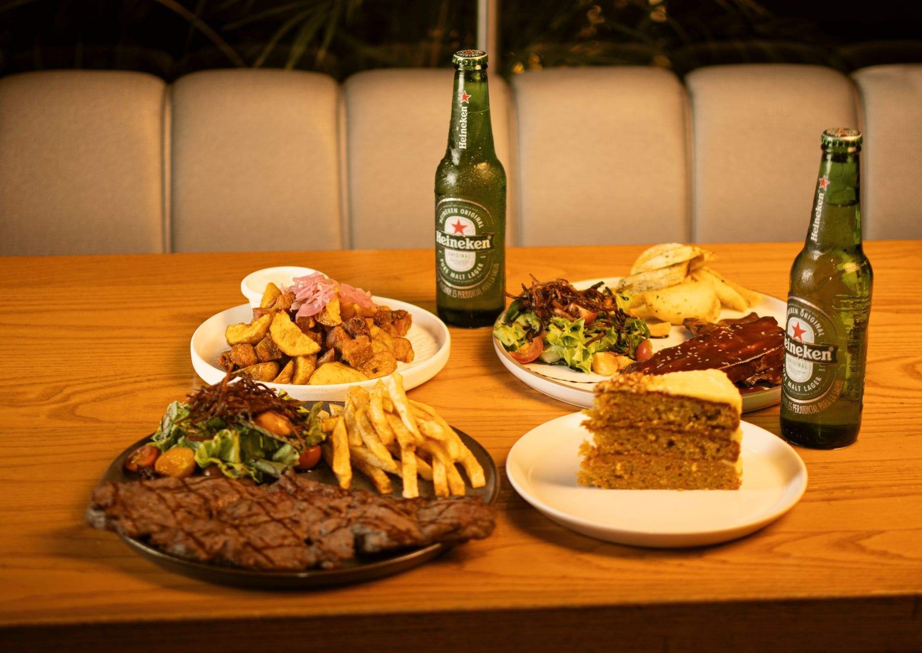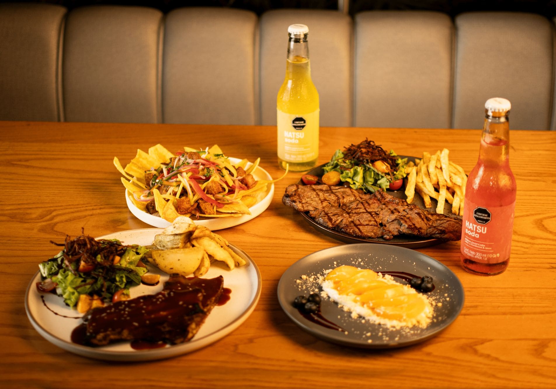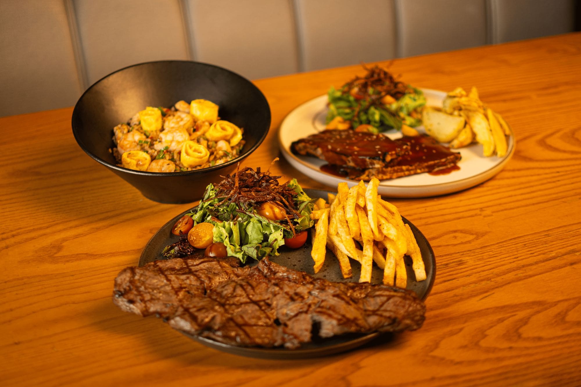 - Churrasco al grill: 200g de chata de res en corte mariposa, acompañado de ensalada de la casa y papas a la francesa