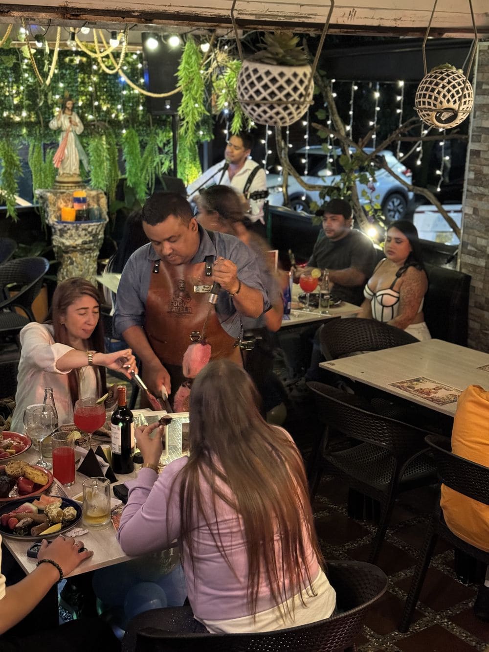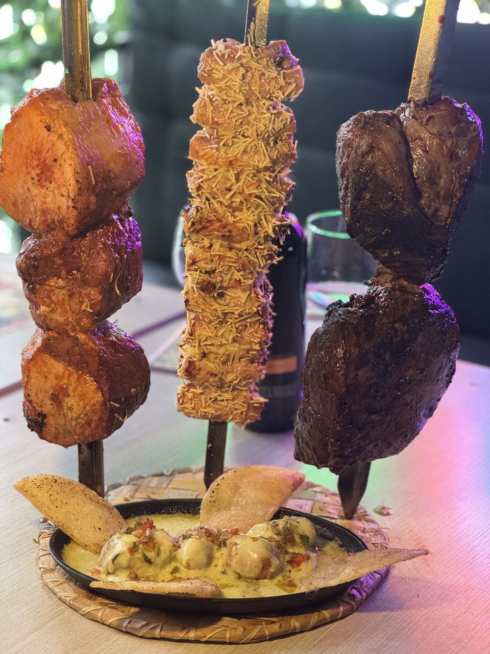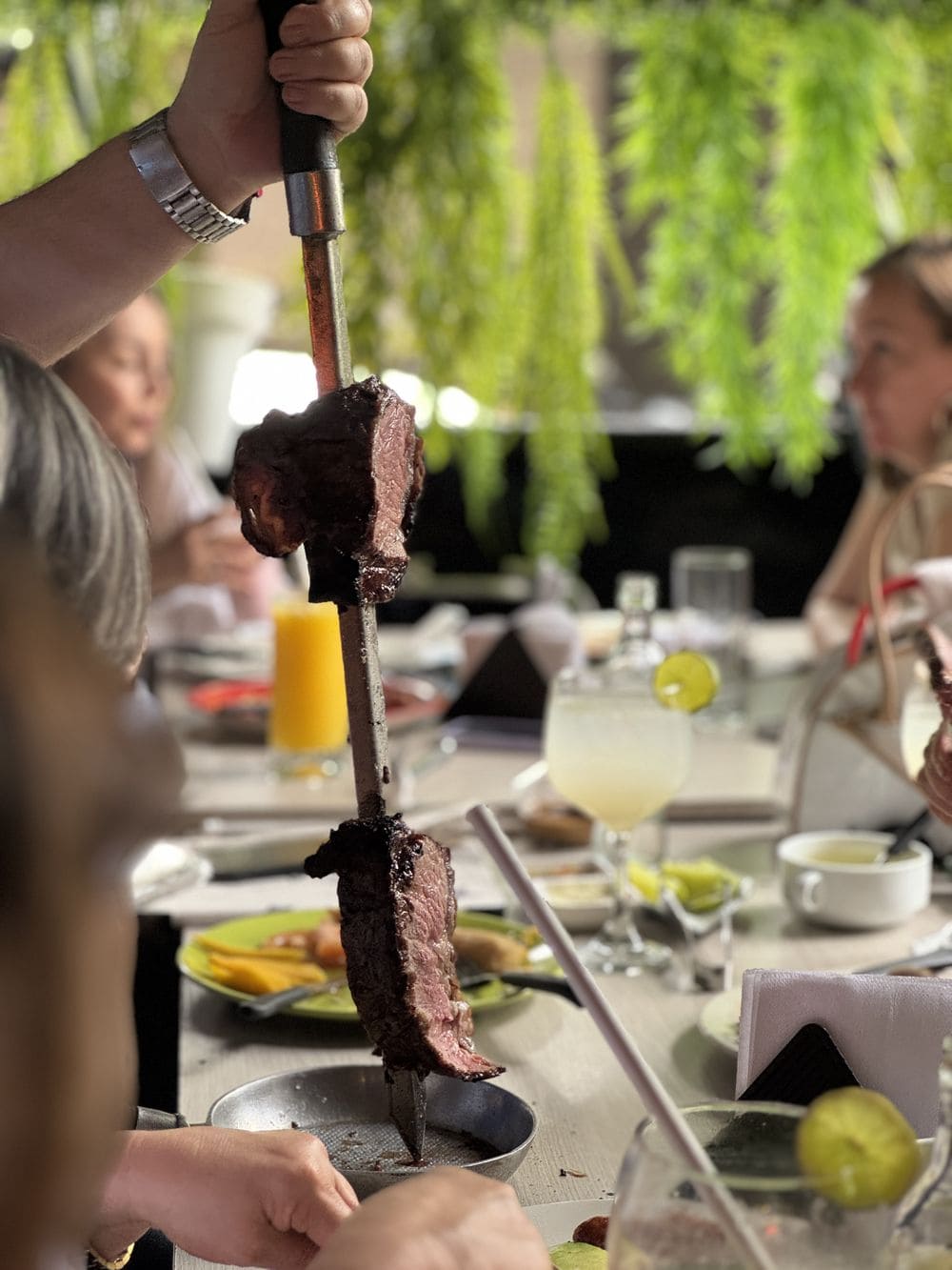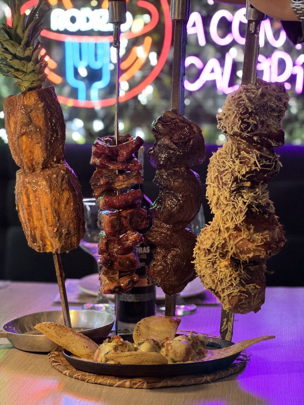 - 5 cortes de carne premium servidos en espada, acompañados de ensalada, frijoles brasileros, papa al vapor y maduro calado