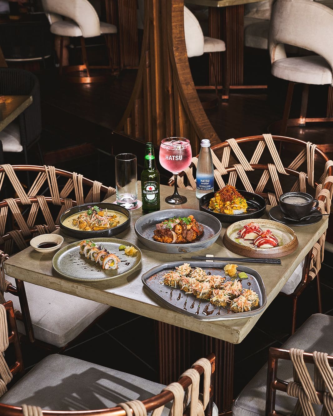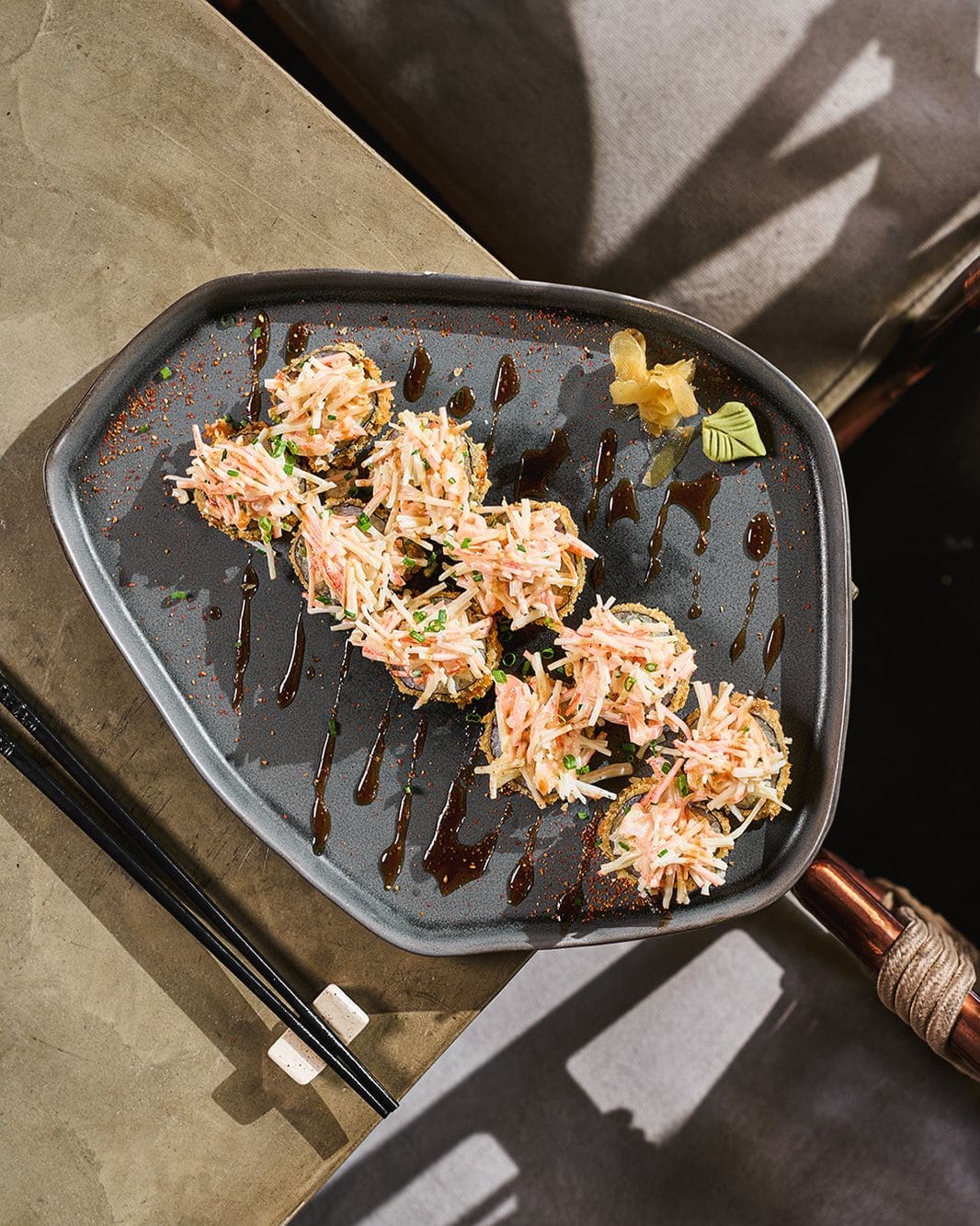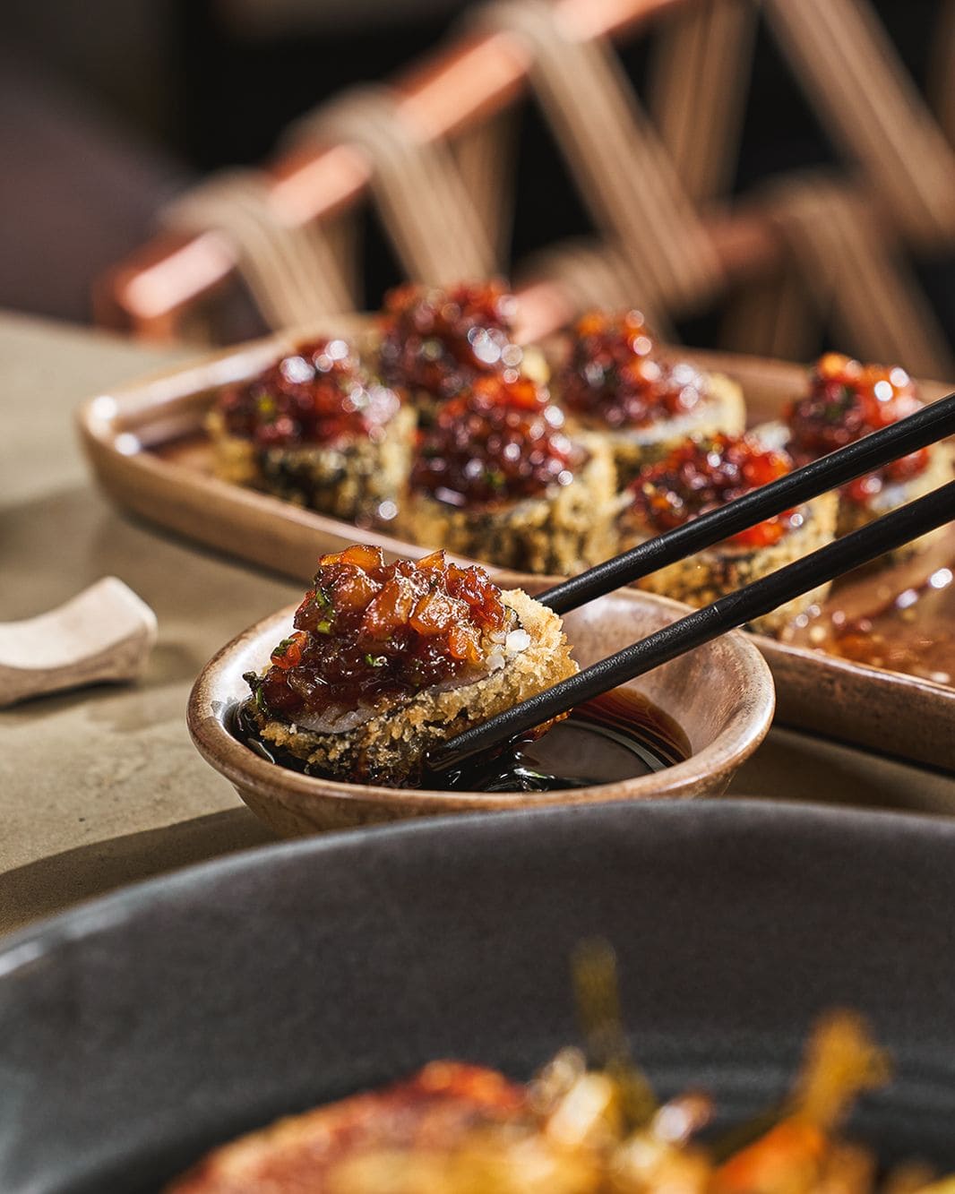 - Tempura-maki: Roll apanado en panko relleno de atún, aguacate y queso philadelphia, coronado con tartar de salmón, salsa de anguila, salsa de soja y salsa teriyaki y cebollín.