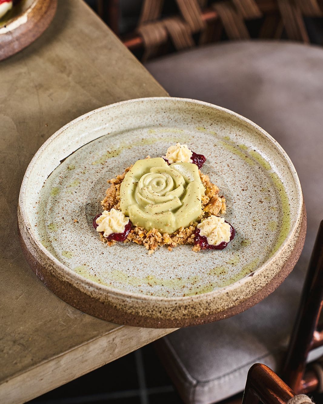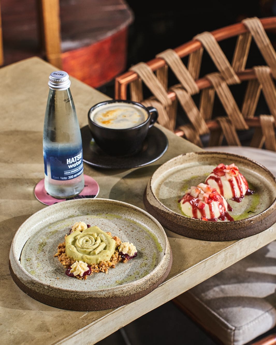 - Panacota de matcha: Postre frío con matcha y vainilla, galleta de maíz cancha, chantilly de miso y aceite verde de menta.