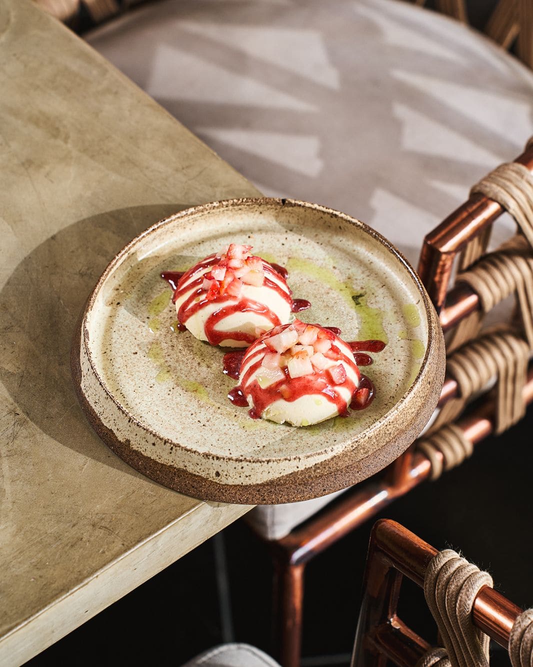 - Queso helado: Coco con canela, bañado en salsa de fresa y chicha morada terminado con aceite verde de hierbabuena y menta.