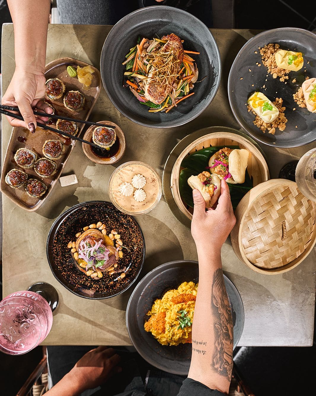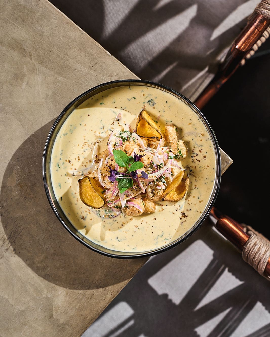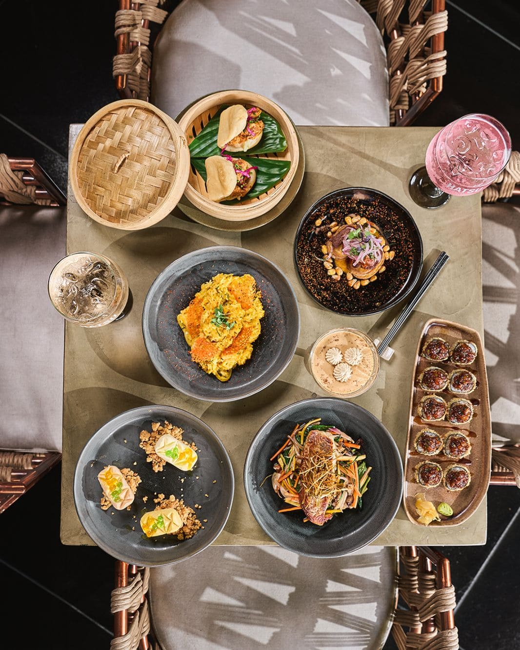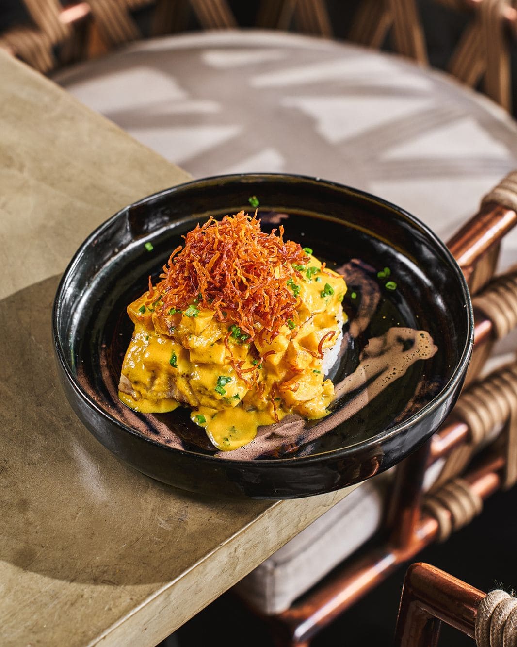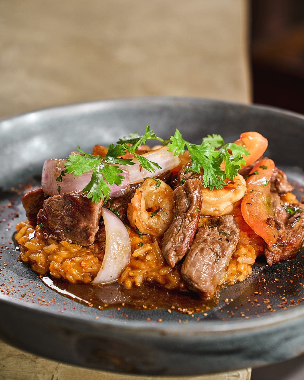 - Cremoso de pimentón: Arroz cremoso a base de pimentón ahumado con lomo saltado de camarones, togarashi y cogollos de cilantro.