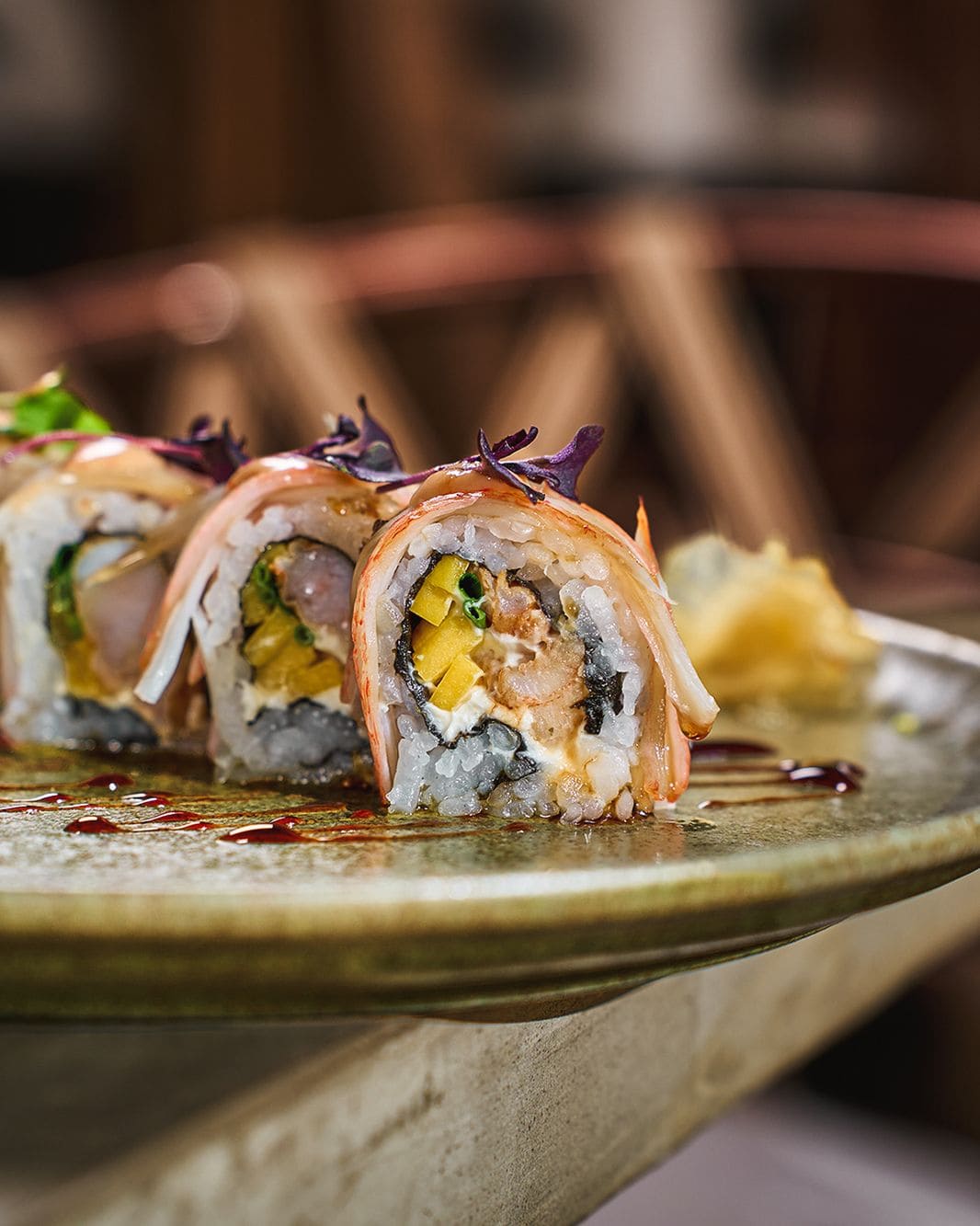 - Furai roll: Roll relleno con salmón, aguacate y queso philadelphia, apanado en panko coronado con tartar de camarón y mixtura de cangrejo, terminado con teriyaki de manzana y furikake.