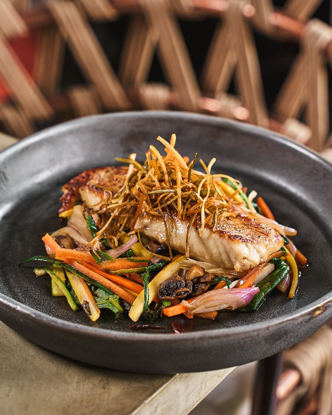 - Pesca blanca parrillada: Pesca blanca rostizada con emulsión de vino blanco y mantequilla acompañada de vegetales al wok, pure de coliflor blanco y puerro crocante.