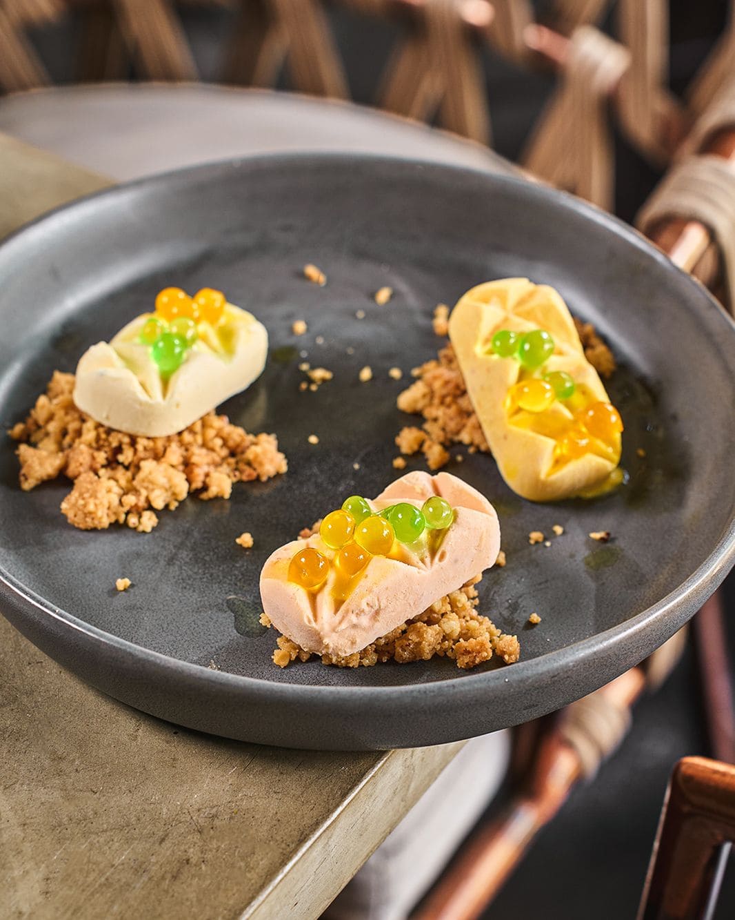 - Trilogía de helado: Ají amarillo y uchuva, rocoto y fresa, maracuyá con limón y cardamomo, esferas de maracuyá y manzana verde