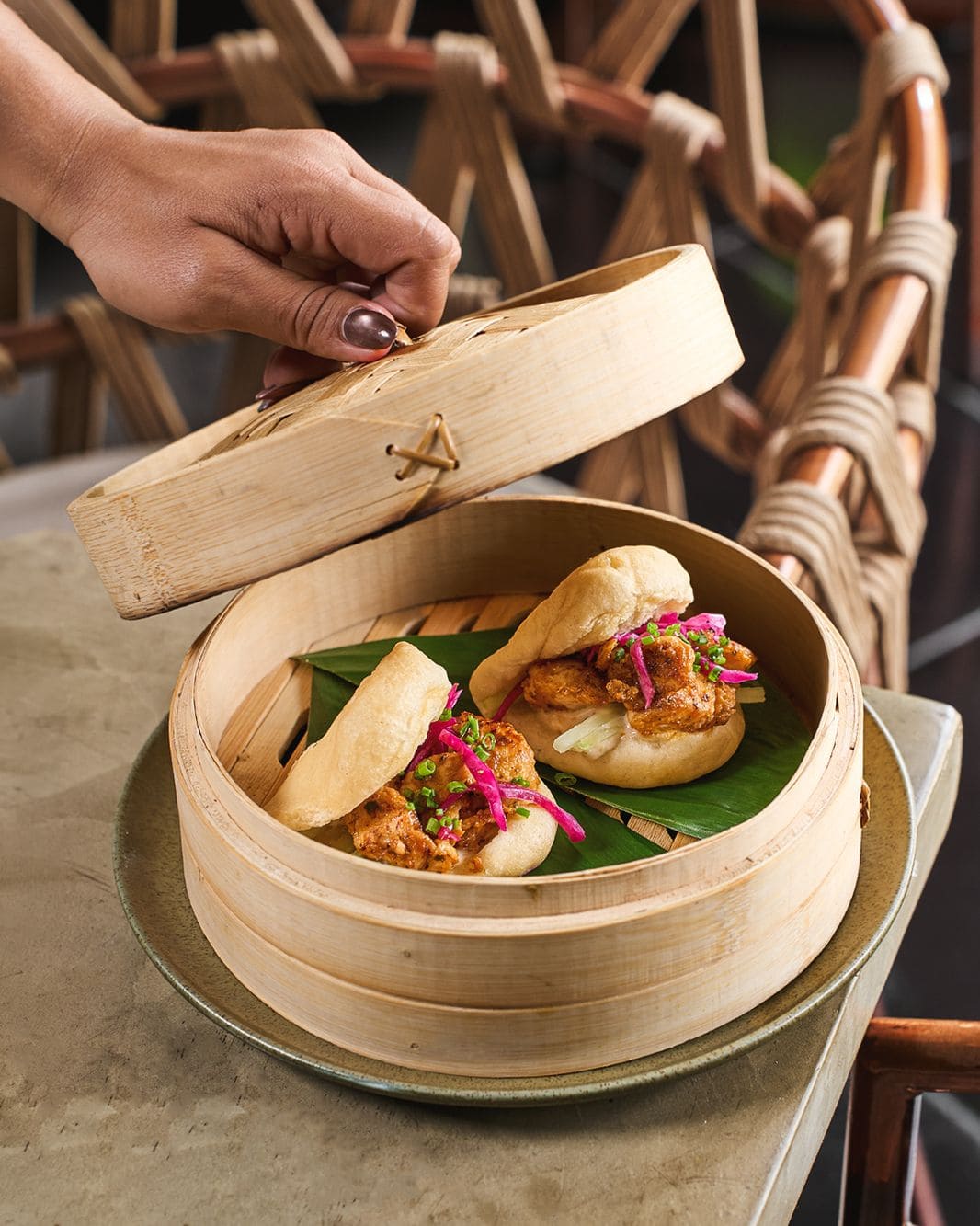 - Bao de pollo: Pollo marinado en salsa peruana, pepino fresco, repollo morado encurtido, salsa acevichada y cebollín.