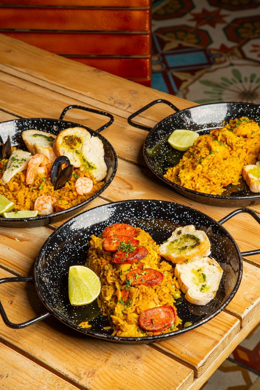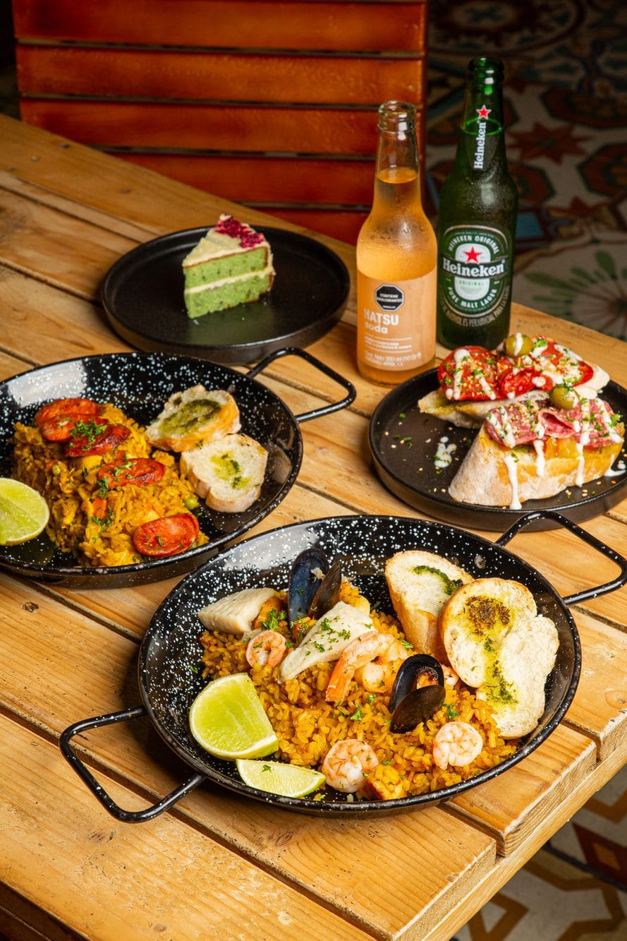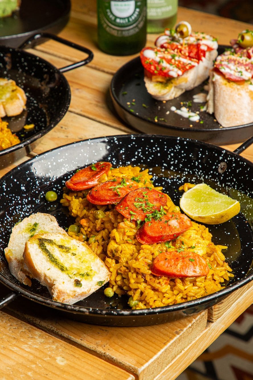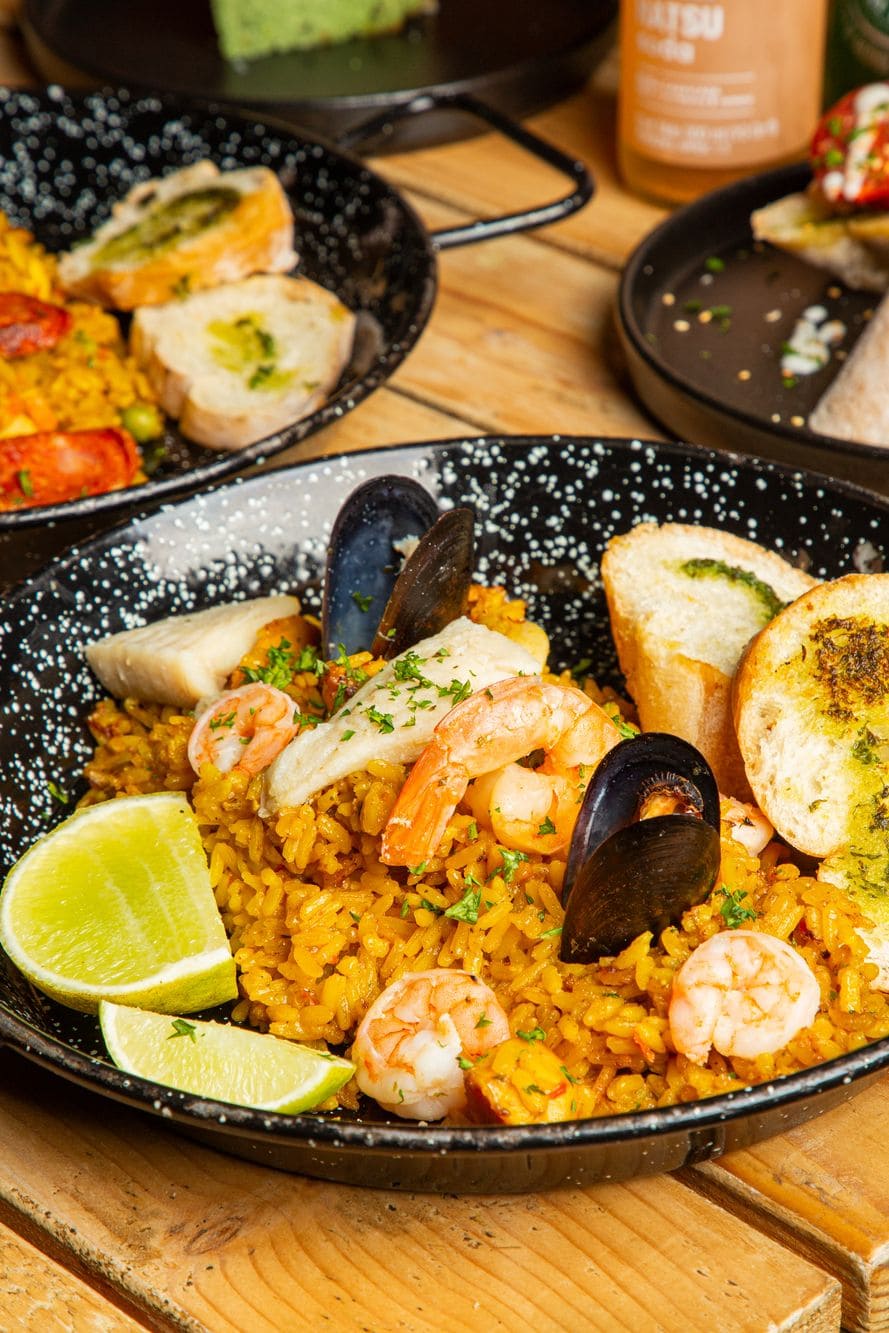 - Paella campera: Receta tradicional con pollo, cerdo y chorizo español, cocinados lentamente con un mix de verduras frescas (zanahoria y arveja) que realzan su sabor casero y auténtico. Se sirve acompañada de pan artesanal tostado y un toque de limón fresco para resaltar cada bocado.