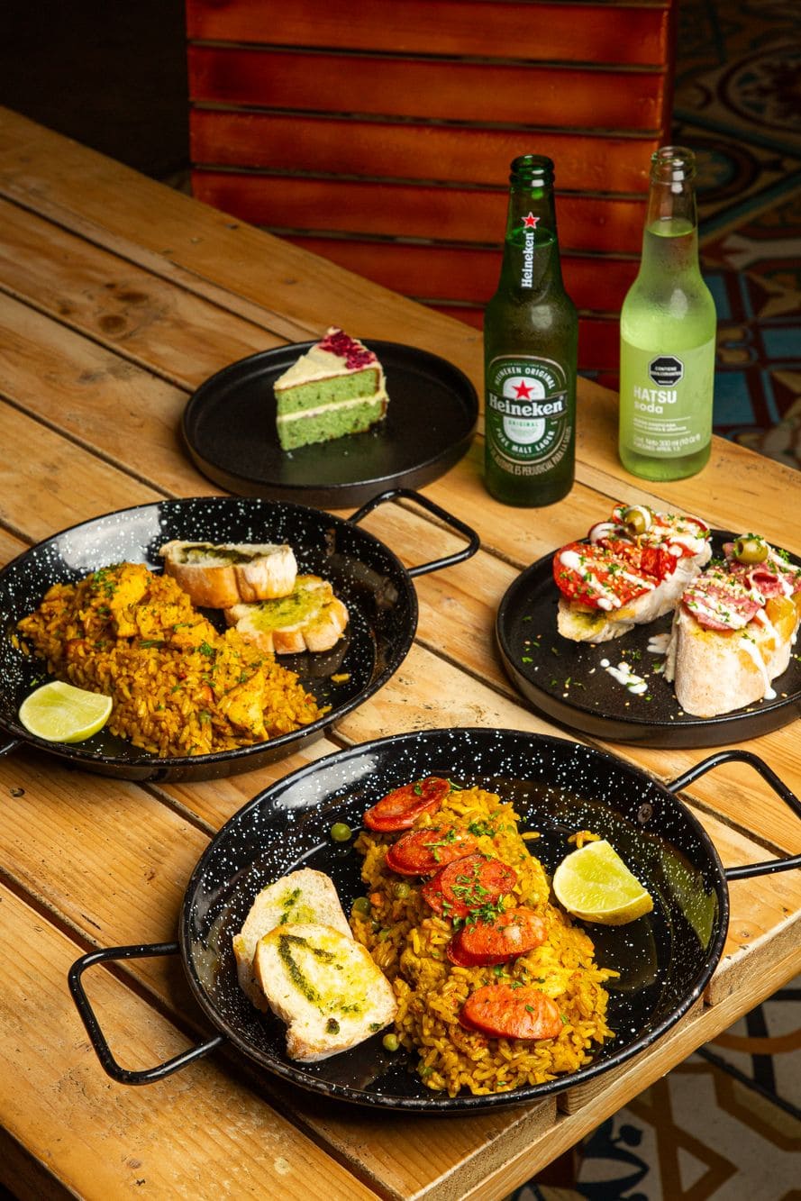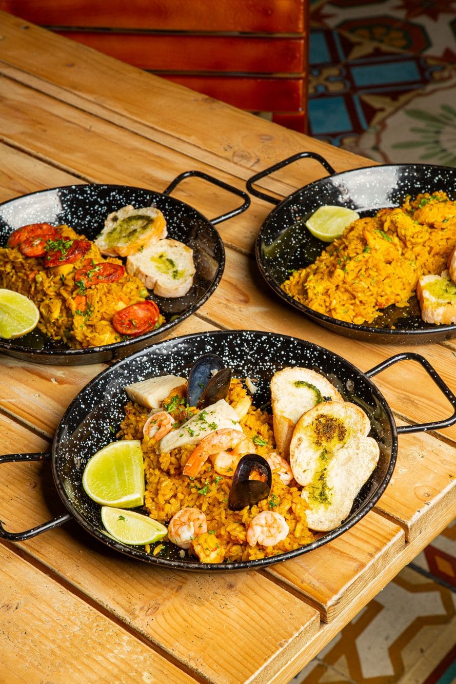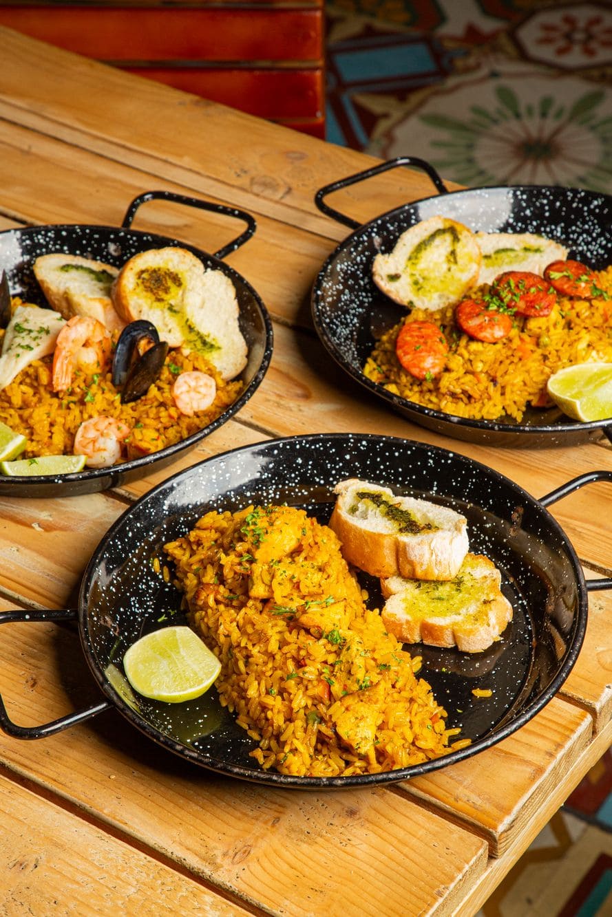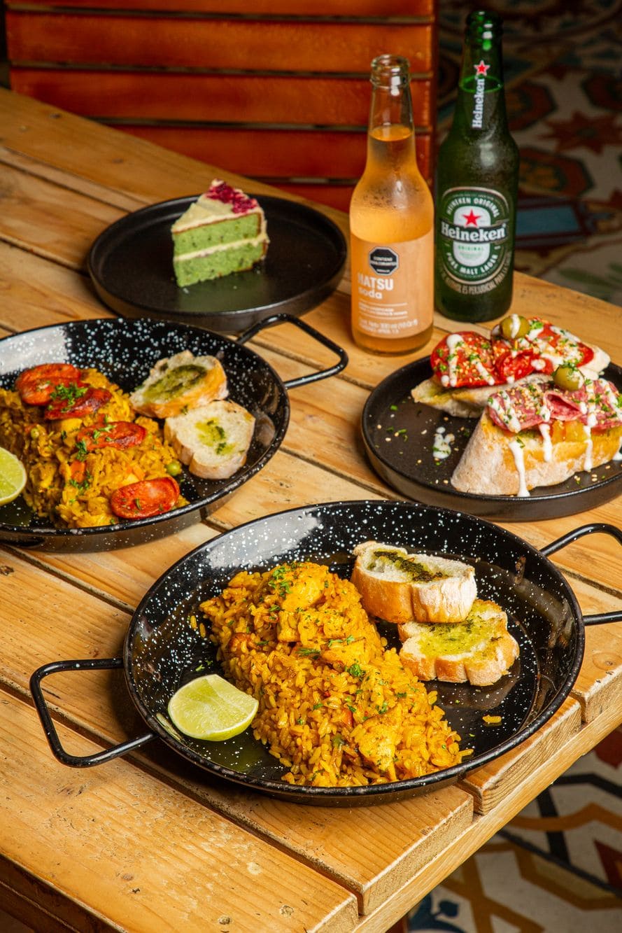 - Paella campera: Receta tradicional con pollo, cerdo y chorizo español, cocinados lentamente con un mix de verduras frescas (zanahoria y arveja) que realzan su sabor casero y auténtico. Se sirve acompañada de pan artesanal tostado y un toque de limón fresco para resaltar cada bocado.