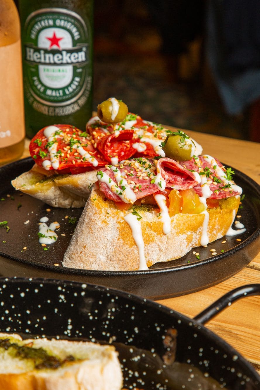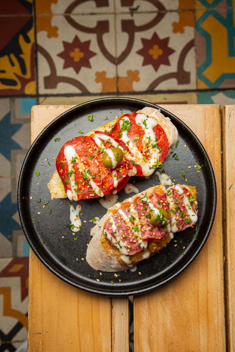 - Tapa de salami pimienta: Base de pan artesanal tostado con majada y tumaca de tomate fresco, cubierta con rodajas de salami a la pimienta que aportan carácter y un matiz especiado. Acompañada de aceitunas mediterráneas, un sutil hilo de alioli, semillas de ajonjolí blanco y perejil fresco. Una combinación equilibrada entre lo rústico y lo sofisticado.