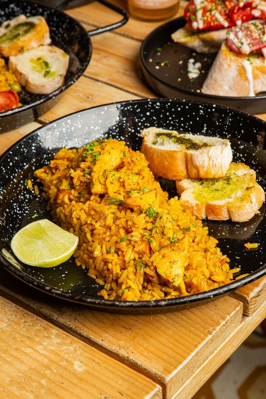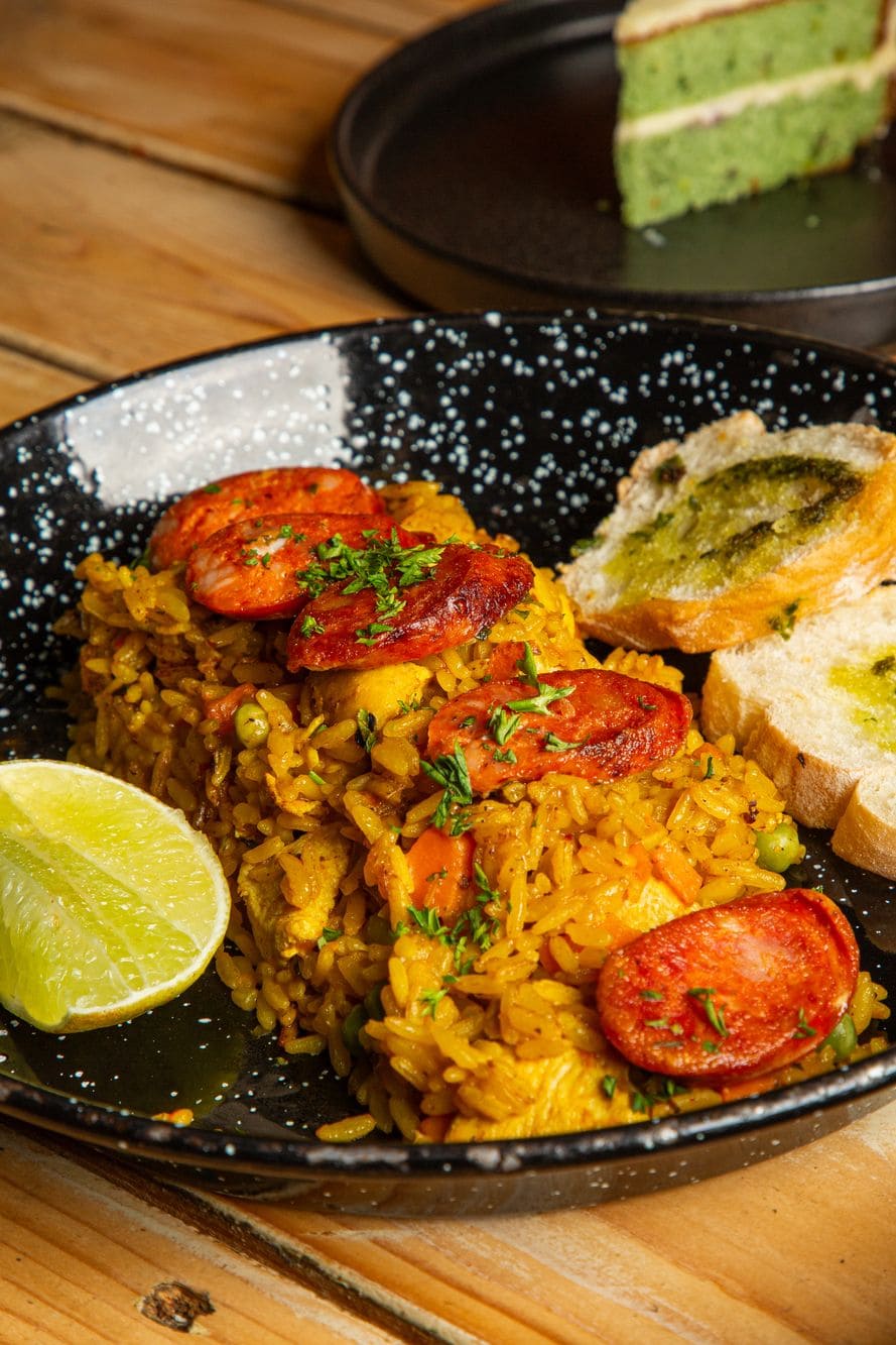 - Paella de pollo: Una interpretación casera y deliciosa de la tradicional paella española. Preparada con jugosa pechuga de pollo, acompañada de un colorido mix de zanahoria y arveja, que aportan frescura y textura. Servida con pan artesanal tostado con majada y un toque de limón fresco, que realzan cada bocado con aromas mediterráneos.