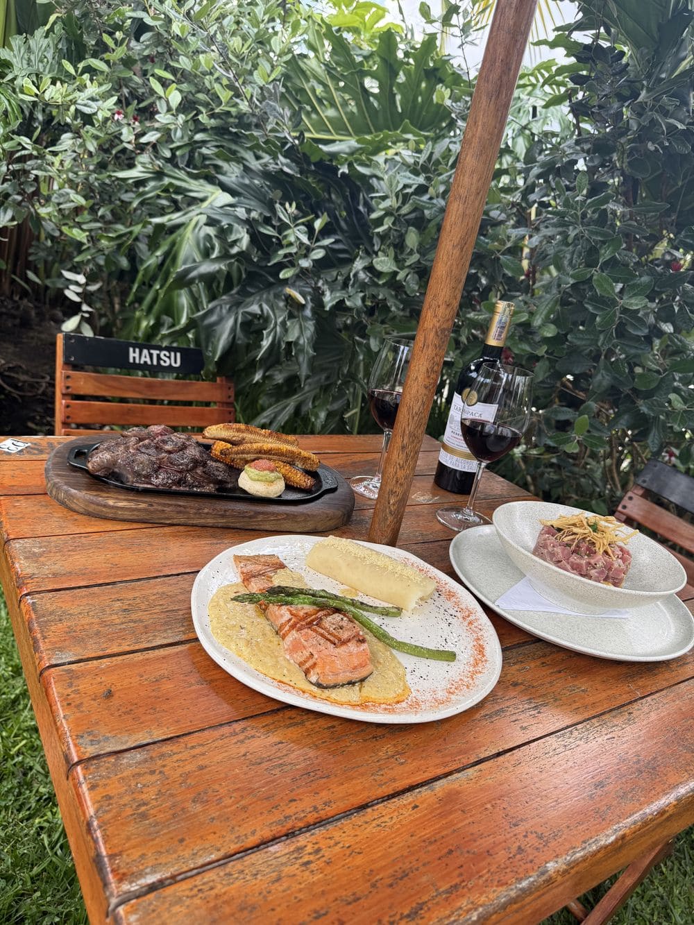 - Salmón a la parrilla: Filete de salmón sellado a la parrilla, servido sobre un cremoso de parmesano que aporta untuosidad y equilibrio, resaltando sus notas suaves y su textura delicada.🐟
