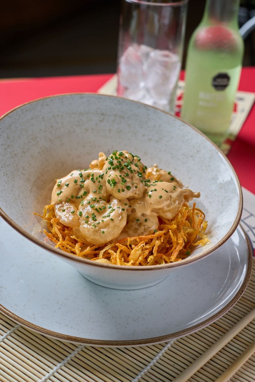 - Camarones dragón: Camarones tempurizados, en una cama de vegetales crocantes, bañados en mayonesa dragón con tope de cebollín picante.