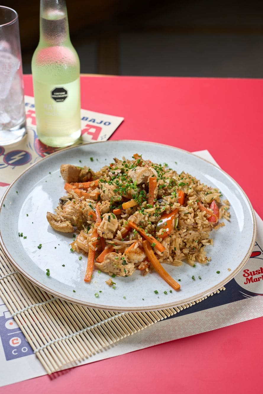 - Arroz cantonés: Delicioso arroz salteado al wok, con pollo, camarones y vegetales frescos.