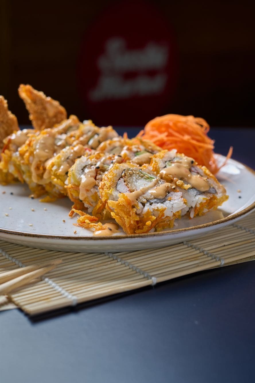 - Samurai: Delicioso roll elaborado con langostinos apanados en ajonjolí, kani, aguacate y queso crema, con tope de vegetales tempura y salsa samurai.