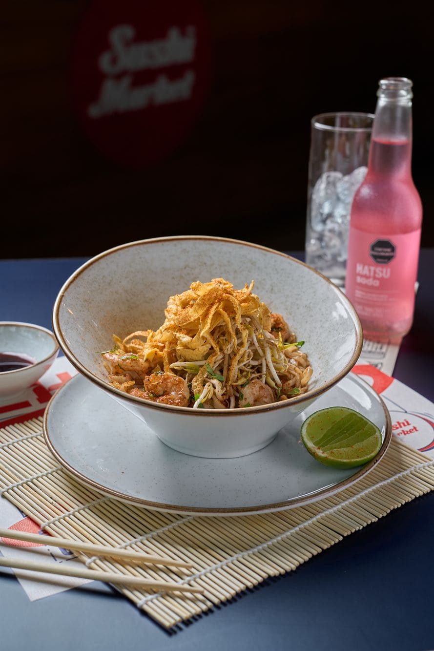 - Pad thai de camarones: Típica preparación tailandesa donde se fusionan camarones, jugo de limón, tallarines de arroz, tortilla de huevo en julianas, raíces chinas, cebolla, cilantro y maní; impregnados de una original salsa de la casa.